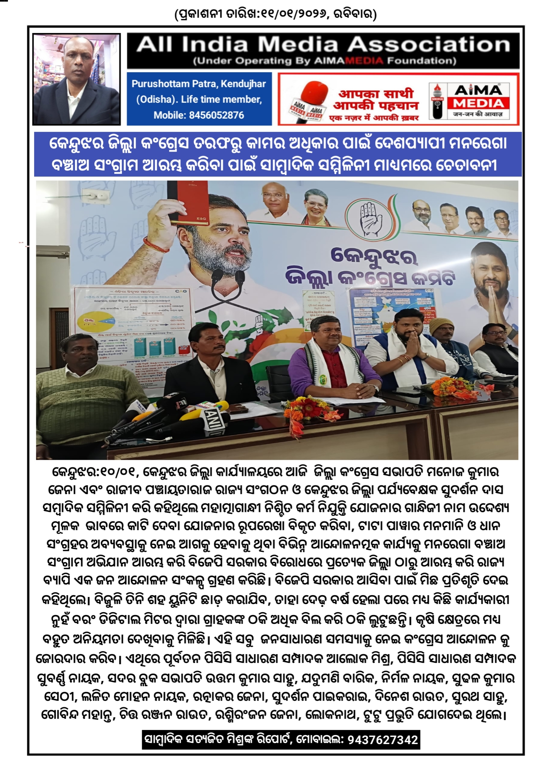 କେନ୍ଦୁଝର ଜିଲ୍ଲା କଂଗ୍ରେସ ତରଫରୁ କାମର ଅଧିକାର ପାଇଁ ଦେଶପ୍ୟାପୀ ମନରେଗା ବଞ୍ଚାଅ ସଂଗ୍ରାମ ଆରମ୍ଭ କରିବା ପାଇଁ ସାମ୍ବାଦିକ ସମ୍ମିଳିନୀ ମାଧ୍ୟମରେ ଚେତାବନୀ।