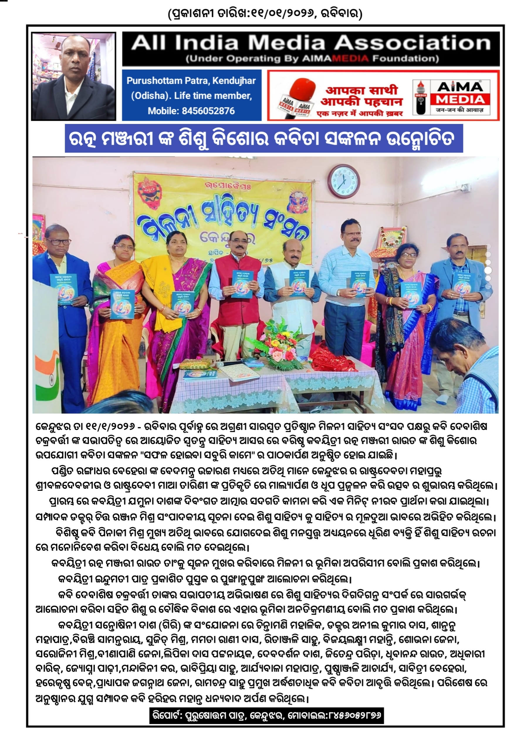 ରତ୍ନ ମଞ୍ଜରୀ ଙ୍କ ଶିଶୁ କିଶୋର କବିତା ସଙ୍କଳନ ଉନ୍ମୋଚିତ।