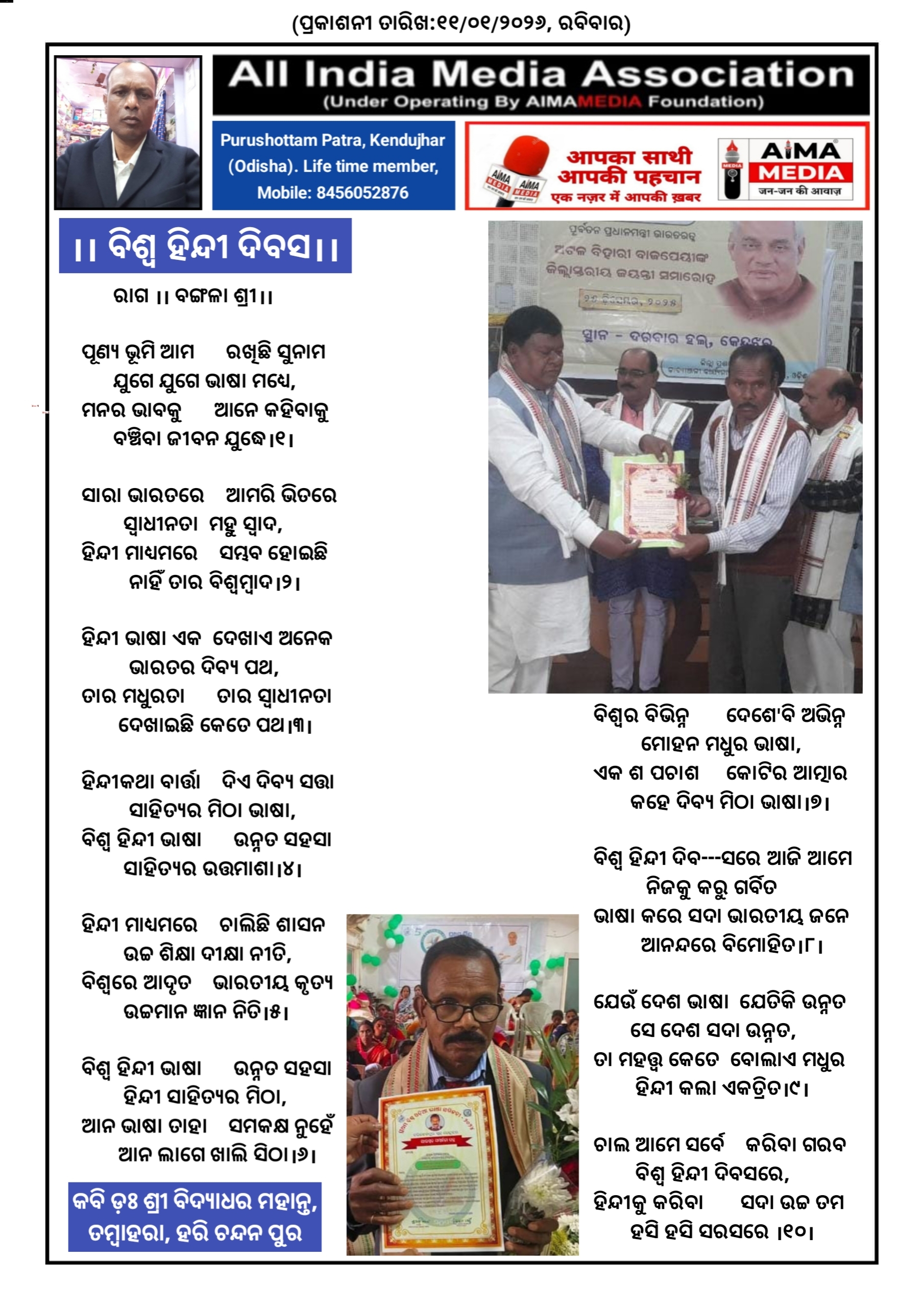 ବିଶ୍ୱ ହିନ୍ଦୀ ଦିବସ - କବି ଡ଼ଃ ବିଦ୍ୟାଧର ମହାନ୍ତ ଙ୍କ ଦ୍ଵାରା ରଚିତ କବିତା।