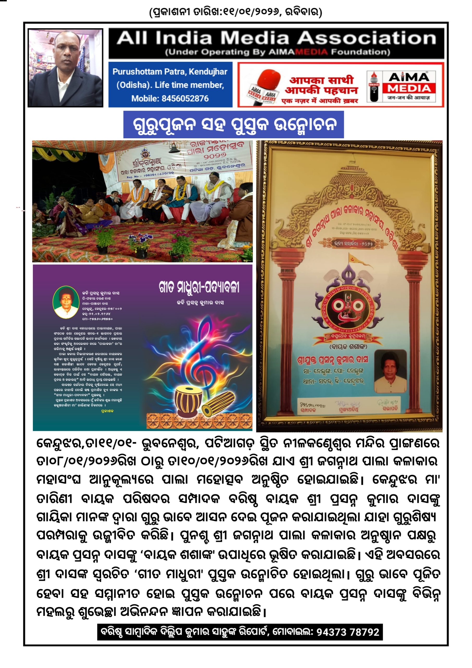 କେନ୍ଦୁଝର,ତା୧୧/୧- ଭୁବନେଶ୍ୱର, ପଟିଆଗଡ଼ ସ୍ଥିତ ନୀଳକଣ୍ଠେଶ୍ଵର ମନ୍ଦିର ପ୍ରାଙ୍ଗଣରେ ତା୮/୧/୨୦୨୬ରିଖ ଠାରୁ ତା୧୦/୧।୨୦୨୬ରିଖ ଯାଏ ଶ୍ରୀ ଜଗନ୍ନାଥ ପାଲା କଳାକାର ମହାସଂଘ ଆନୁକୂଲ୍ୟରେ ପାଲା ମହୋତ୍ସବ ଅନୁଷ୍ଠିତ ହୋଇଯାଇଛି। କେନ୍ଦୁଝର ମା' ତାରିଣୀ ବାୟକ ପରିଷଦର ସମ୍ପାଦକ ବରିଷ୍ଠ ବାୟକ ଶ୍ରୀ ପ୍ରସନ୍ନ କୁମାର ଦାସଙ୍କୁ ଗାୟିକା ମାନଙ୍କ ଦ୍ୱାରା ଗୁରୁ ଭାବେ ଆସନ ଦେଇ ପୂଜନ କରାଯାଇଥିଲା ଯାହା ଗୁରୁଶିଷ୍ୟ ପରମ୍ପରାକୁ ଉଜ୍ଜୀବିତ କରିଛି । ପୁନଶ୍ଚ ଶ୍ରୀ ଜଗନ୍ନାଥ ପାଲା କଳାକାର ଅନୁଷ୍ଠାନ ପକ୍ଷରୁ ବାୟକ ପ୍ରସନ୍ନ ଦାସଙ୍କୁ ‘ବାୟକ ଶଶାଙ୍କ' ଉପାଧିରେ ଭୂଷିତ କରାଯାଇଛି। ଏହି ଅବସରରେ ଶ୍ରୀ ଦାସଙ୍କ ସ୍ଵରଚିତ ‘ଗୀତ ମାଧୁରୀ' ପୁସ୍ତକ ଉନ୍ମୋଚିତ ହୋଇଥିଲା । ଗୁରୁ ଭାବେ ପୂଜିତ ହେବା ସହ ସମ୍ମାନୀତ ହୋଇ ପୁସ୍ତକ ଉନ୍ମୋଚନ ପରେ ବାୟକ ପ୍ରସନ୍ନ ଦାସଙ୍କୁ ବିଭିନ୍ନ ମହଲରୁ ଶୁଭେଚ୍ଛା ଅଭିନନ୍ଦନ ଜ୍ଞାପନ କରାଯାଇଛି।