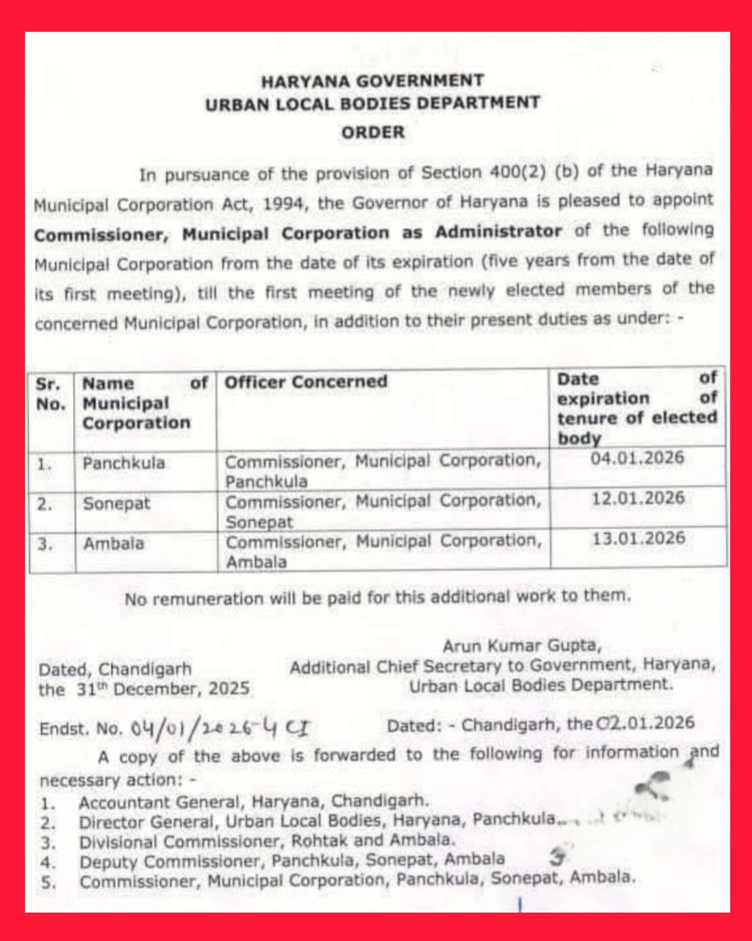 सरकारी आदेश के मुताबिक हरियाणा म्यूनिसिपल कॉरपोरेशन एक्ट 1994 की धारा 400(2)(b) के अंतर्गत नगर निगमों के आयुक्तों को प्रशासक (Administrator) नियुक्त किया गया है। यह व्यवस्था नव-निर्वाचित सदस्यों की पहली बैठक तक लागू रहेगी।