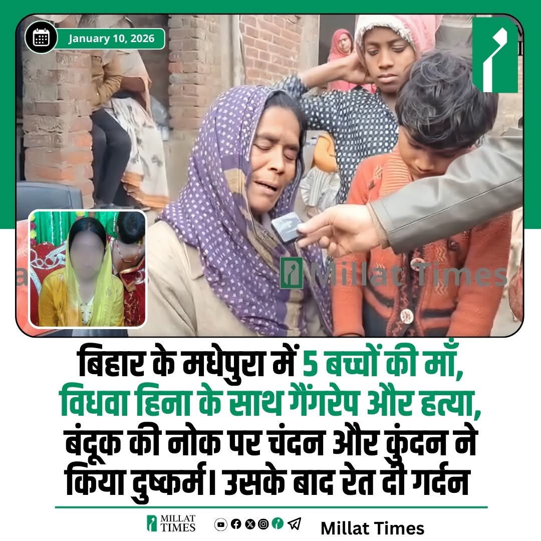 बिहार के मधेपुरा में कुंदन और चंदन नामक दो अपराधियों ने एक विधवा मुस्लिम महिला के साथ गैंगरेप कर गला रेतकर उसकी हत्या कर दी। बीती 3 जनवरी की रात दोनों आरोपियों ने हिना परवीन नाम की 30 वर्षीय विधवा मुस्लिम महिला को उसकी झोपड़ी से बंदूक की नोक पर अगवा किया। अगवा करने के बाद अपराधी उसे करीब 500 मीटर दूर एक फूस के मकान में ले गए, जहां उसके साथ गैंगरेप किया गया। दुष्कर्म के बाद दोनों ने महिला की गर्दन रेतकर हत्या कर दी। हिना परवीन के छह छोटे-छोटे बच्चे हैं। उनके पति मोहम्मद अताबुल की एक वर्ष पहले मौत हो गई थी, जिसके बाद हिना परवीन मेहनत-मजदूरी कर अपने बच्चों का पालन-पोषण कर रही थीं। अब ये बच्चे माता-पिता दोनों से वंचित हो गए हैं।