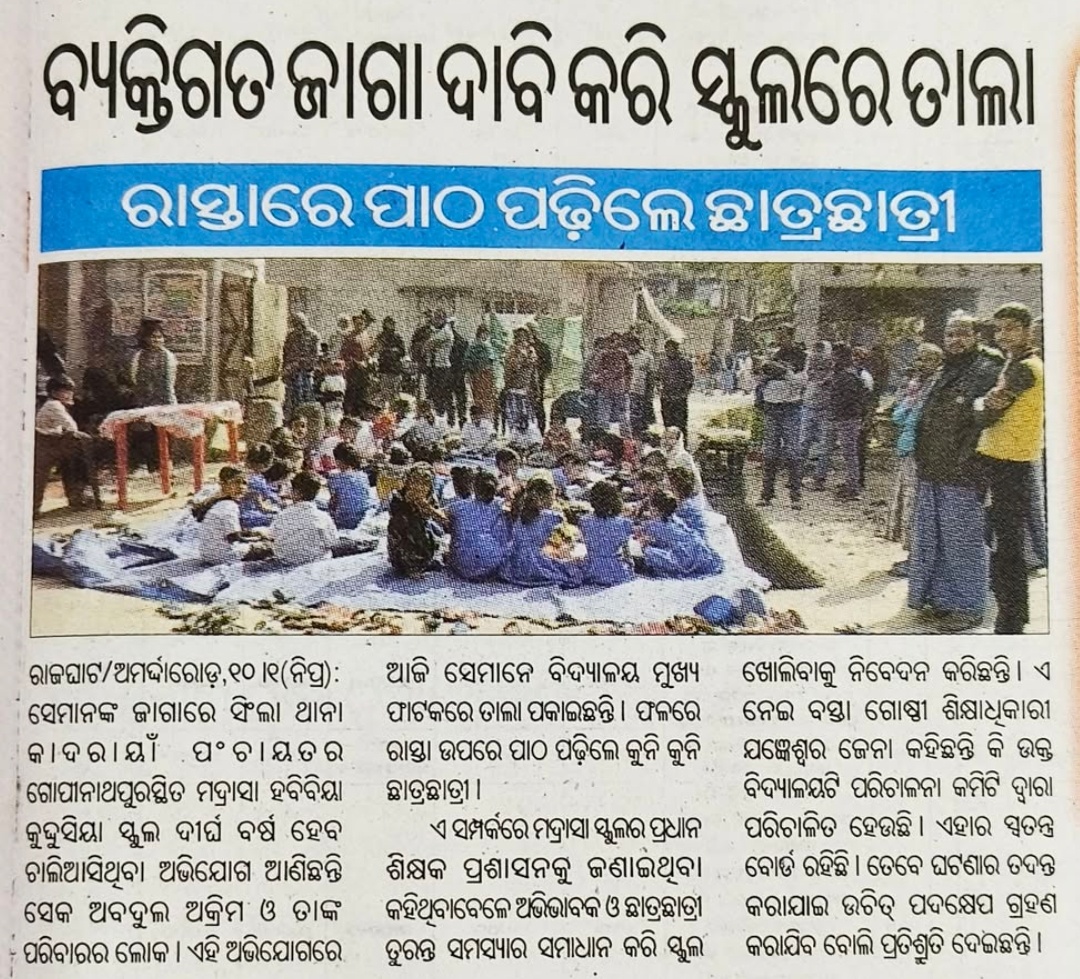 ରାଜଘାଟ ଅମର୍ଧାରେ।ଡ୍ ସେମାନଙ୍କ ଜାଗାରେ ସିଂଲା ଥାନା କାଦରାୟଂ ପଂଚାୟତର ଗପୀନାଥପୁରସ୍ଥିତ ମାଦ୍ରାସା ହବିବିୟା କୁଦ୍ଧୁସିଆ ସ୍କୁଲ ଦୀର୍ଘ ବର୍ଷ ହେବ ଚାଲିଆସିଥିବା ଅଭିଯୋଗ ଆଣିଛନ୍ତି ସେକ୍ ଅବଦୁଲ ଅକ୍ରିମ ଓ ତାକଂ ପରିବାର ଲୋକ।ଏହି ଅଭିଯୋଗରେ ସେମାନେ ସ୍କୁଲ ଫାଟକରେ ତାଲା ପକାଇଛନ୍ତି।ଯାହା ଦ୍ବାରା କୁନି କୁନି ପିଲାମାନେ ରାସ୍ତାରେ ପାଠ ପଢୁଛନ୍ତି।ମାଦ୍ରାସା ସ୍କୁଲ ପ୍ରଧାନ ଶିକ୍ଷକ ପ୍ରଶାସନ କୁ ଜଣାଇଥିବାବେଳେ ତୁରନ୍ତ ଏ ସମସ୍ୟାର ସମାଧାନ କରି ସ୍କୁଲ ଖେ।ଲିବାକୁ ନିବେଦନ କରିଛନ୍ତି।