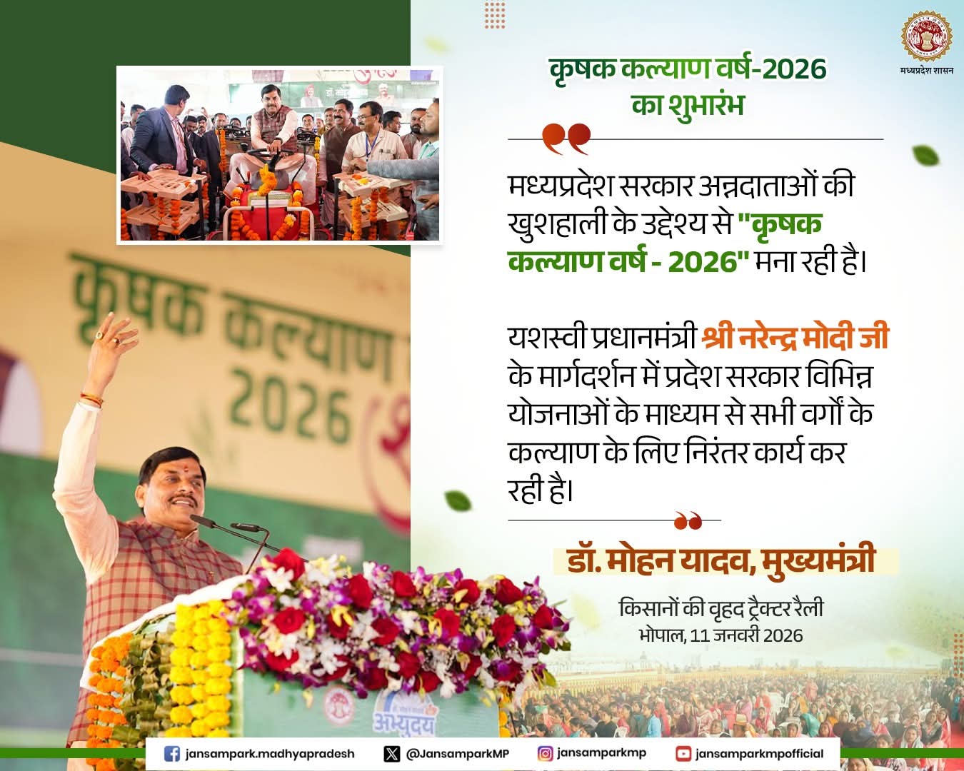 मध्यप्रदेश सरकार अन्नदाताओं की खुशहाली के उद्देश्य से "कृषक कल्याण वर्ष-2026" मना रही हैं।