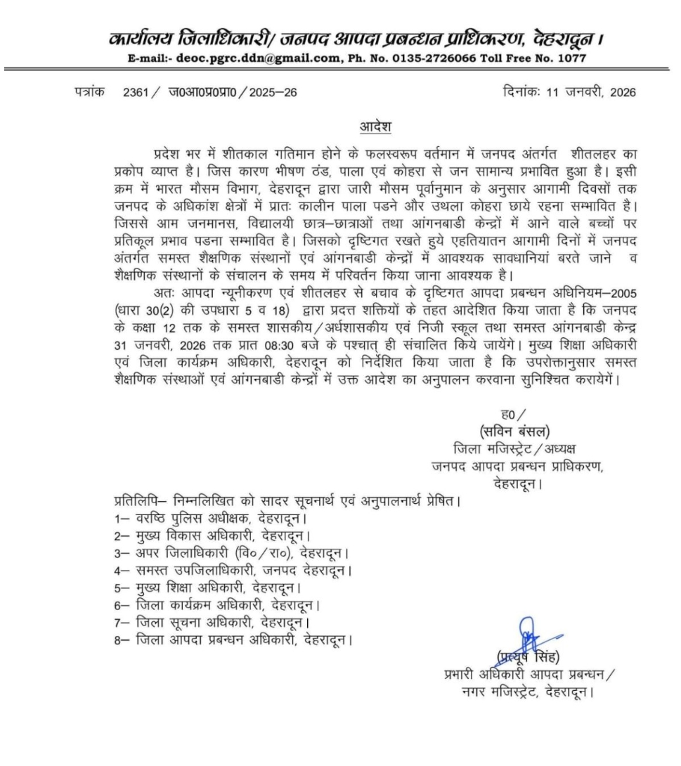 जारी आदेश के अनुसार देहरादून जिले के अंतर्गत आने वाले सभी शासकीय, अर्ध-शासकीय, आंगनबाड़ी एवं निजी विद्यालयों—कक्षा 12वीं तक—के संचालन समय में परिवर्तन किया गया है। अब ये सभी स्कूल सुबह 8:30 बजे के बाद ही खोले जाएंगे।