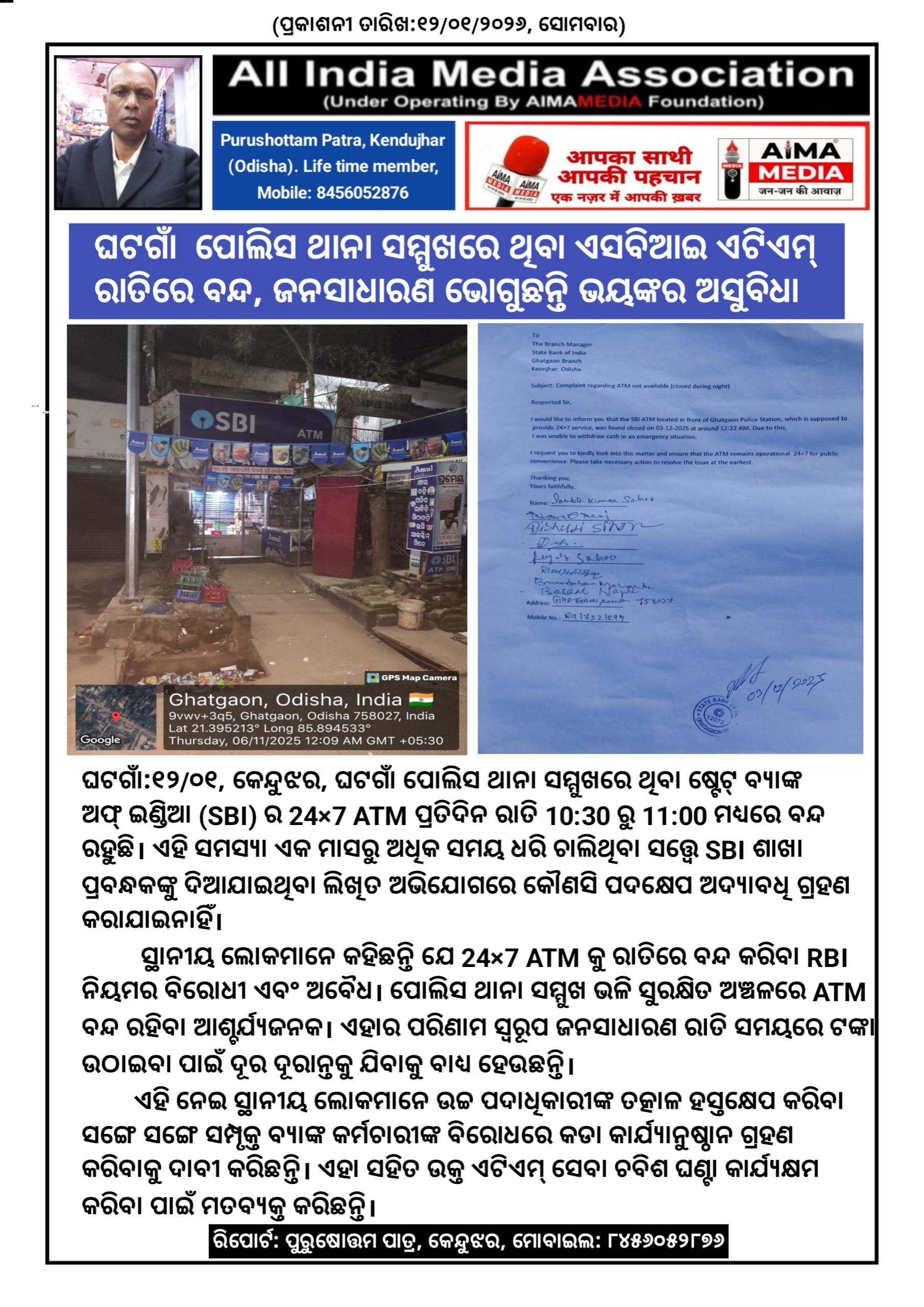 ଘଟଗାଁ:୧୨/୦୧, କେନ୍ଦୁଝର, ଘଟଗାଁ ପୋଲିସ ଥାନା ସମ୍ମୁଖରେ ଥିବା ଷ୍ଟେଟ୍ ବ୍ୟାଙ୍କ ଅଫ୍ ଇଣ୍ଡିଆ (SBI) ର 24×7 ATM ପ୍ରତିଦିନ ରାତି 10:30 ରୁ 11:00 ମଧ୍ୟରେ ବନ୍ଦ ରହୁଛି। ଏହି ସମସ୍ୟା ଏକ ମାସରୁ ଅଧିକ ସମୟ ଧରି ଚାଲିଥିବା ସତ୍ତ୍ୱେ SBI ଶାଖା ପ୍ରବନ୍ଧକଙ୍କୁ ଦିଆଯାଇଥିବା ଲିଖିତ ଅଭିଯୋଗରେ କୌଣସି ପଦକ୍ଷେପ ଅଦ୍ଯାବଧି ଗ୍ରହଣ କରାଯାଇନାହିଁ।