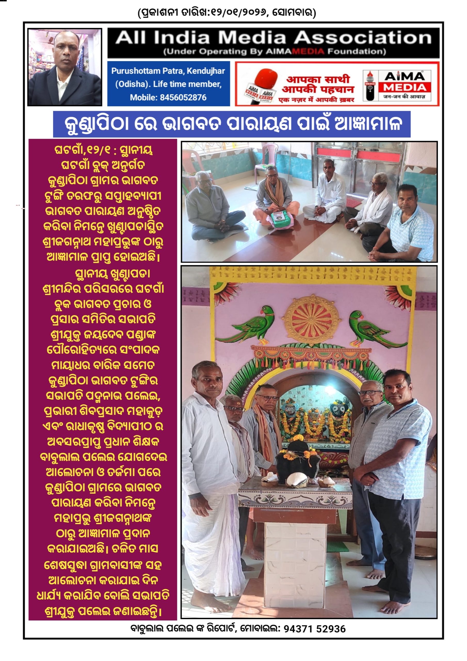 କୁଣ୍ଡାପିଠା ରେ ଭାଗବତ ପାରାୟଣ ପାଇଁ ଆଜ୍ଞାମାଳ।