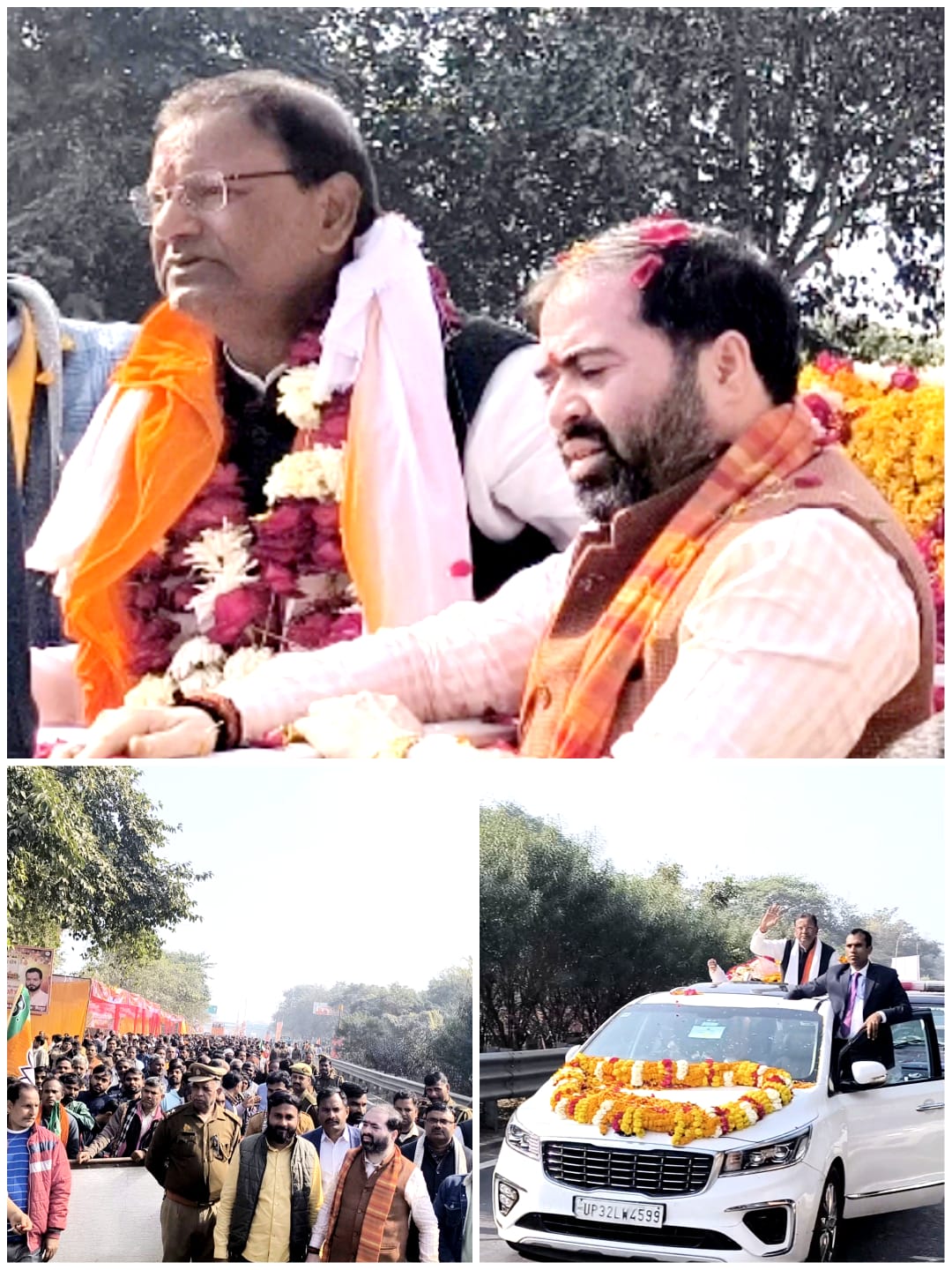 अहमदपुर, बाराबंकी। आज का दिन दरियाबाद विधानसभा वासियों के लिए विशेष रहा। सुबह से ही योगी, मोदी, पंकज चौधरी जिंदाबाद के नारों से अहमदपुर टोल प्लाजा क्षेत्र गुंजायमान रहा। हर ओर भाजपा प्रदेश अध्यक्ष पंकज चौधरी के आने का हर्ष और उल्लास का माहौल रहा। दोपहर लगभग एक बजकर तीस मिनट पर भाजपा प्रदेश अध्यक्ष का काफिला अहमदपुर टोल प्लाजा पहुँचा जहाँ पर खाद्य एवं रसद राज्यमंत्री सतीश चन्द्र शर्मा ने भाजपा प्रदेश अध्यक्ष पंकज चौधरी को माला पहनाकर गर्म जोशी से स्वागत किया। कार्यकर्ताओं, आमजनमानस ने भाजपा प्रदेश अध्यक्ष पर फूलों की वर्षा की। बुल्डोजर से भी फूलों की वर्षा की गई। क्षेत्रीय पुलिस बल चौकी प्रभारी अहमदपुर आलोक सिंह, सी ओ सौरभ श्रीवास्तव, बदोसराॅय कोतवाल अजीत विद्यार्थी, एस आई सालिक राय सहित भारी पुलिस बल मुस्तैद रहा। इस अवसर पर प्रमोद तिवारी, मुलायम सिंह यादव, सूर्य प्रकाश शुक्ला, गंगा प्रसाद दीक्षित, रवि सिंह, आशीष सिंह, सौरभ दीक्षित, अनिल कुमार, मुकेश कुमार, राज कुमार, जगदम्बा सिंह, संजय अवस्थी सहित आमजन की उपस्थिति रही।