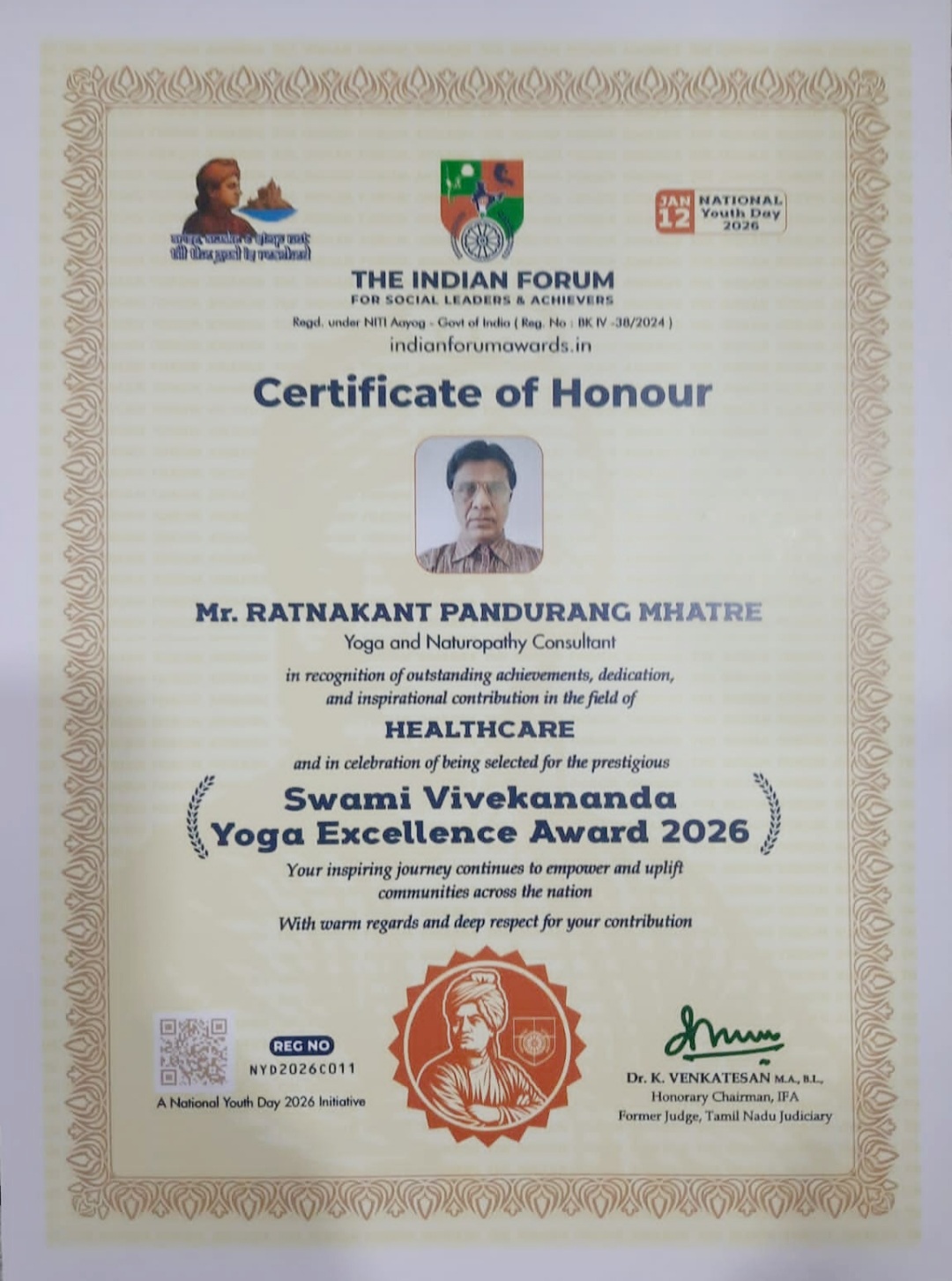रत्नकांत म्हात्रे (योगनिसर्गोपचातज्ञयांना त्यांच्या कौतुकास्नाबद्दल " स्वामी विवेकानंद योग एक्सलन्स अवॉर्ड 2026 "प्रधान....