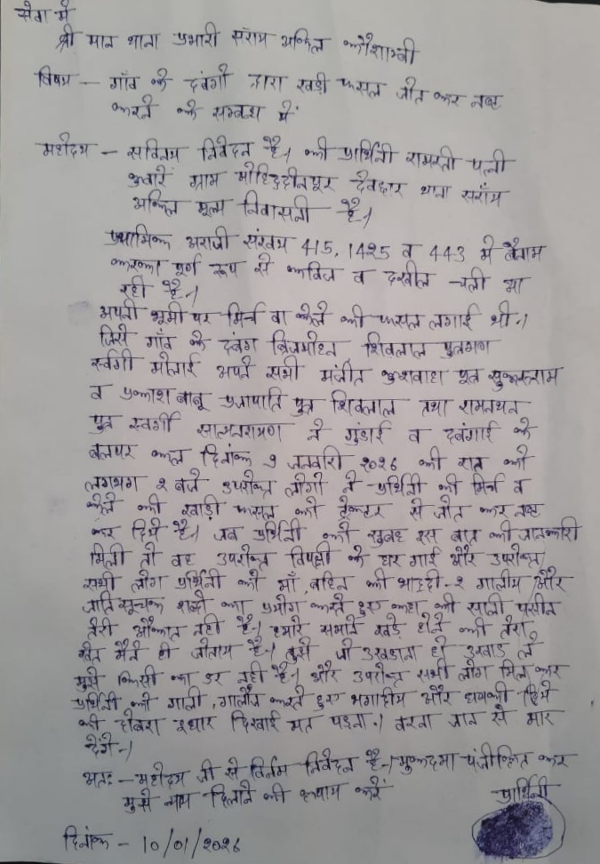 दबंगों ने ट्रैक्टर चढ़ाकर जानबूझकर उनकी पूरी फसल को रौंदकर नष्ट कर दिया। जब रामरती न्याय की गुहार लेकर उनके घर पहुंचीं, तो उन्हें न सिर्फ डराया-धमकाया गया, बल्कि जातिसूचक गालियां देकर जान से मारने की धमकी भी दी गई। आरोपियों में बृजमोहन प्रजापति, शिवलाल प्रजापति, मनजीत कुशवाहा, सुकरू राम, प्रकाश बाबू, शिवलाल, रामनथन, बबलू प्रजापति जैसे नाम शामिल हैं।