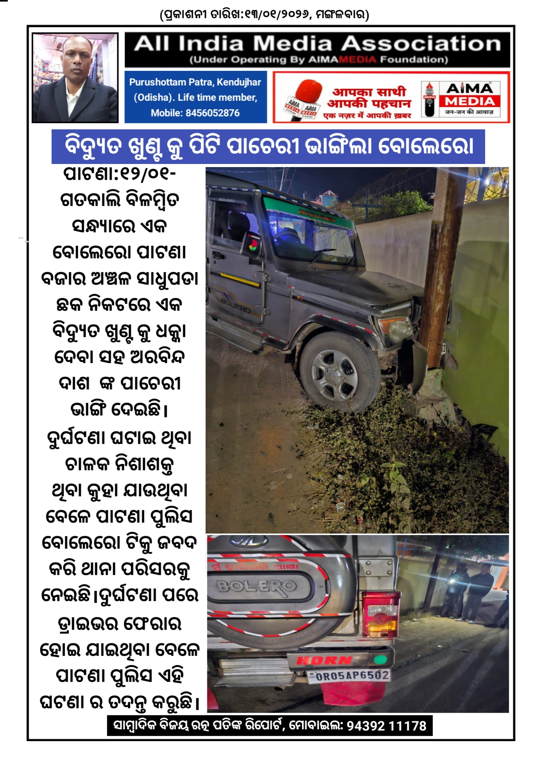 ପାଟଣା:୧୨/୦୧ -ଗତକାଲି ବିଳମ୍ବିତ ସନ୍ଧ୍ୟାରେ ଏକ ବୋଲେରୋ ପାଟଣା ବଜାର ଅଞ୍ଚଳ ସାଧୁପଡା ଛକ ନିକଟରେ ଏକ ବିଦ୍ୟୁତ ଖୁଣ୍ଟ କୁ ଧକ୍କା ଦେବା ସହ ଅରବିନ୍ଦ ଦାଶ ଙ୍କ ପାଚେରୀ ଭାଙ୍ଗି ଦେଇଛି।ଦୁର୍ଘଟଣା ଘଟାଇ ଥିବା ଚାଳକ ନିଶାଶକ୍ତ ଥିବା କୁହା ଯାଉଥିବା ବେଳେ ପାଟଣା ପୁଲିସ ବୋଲେରୋ ଟିକୁ ଜବଦ କରି ଥାନା ପରିସରକୁ ନେଇଛି।ଦୁର୍ଘଟଣା ପରେ ଡ୍ରାଇଭର ଫେରାର ହୋଇ ଯାଇଥିବା ବେଳେ ପାଟଣା ପୁଲିସ ଏହି ଘଟଣା ର ତଦନ୍ତ କରୁଛି।