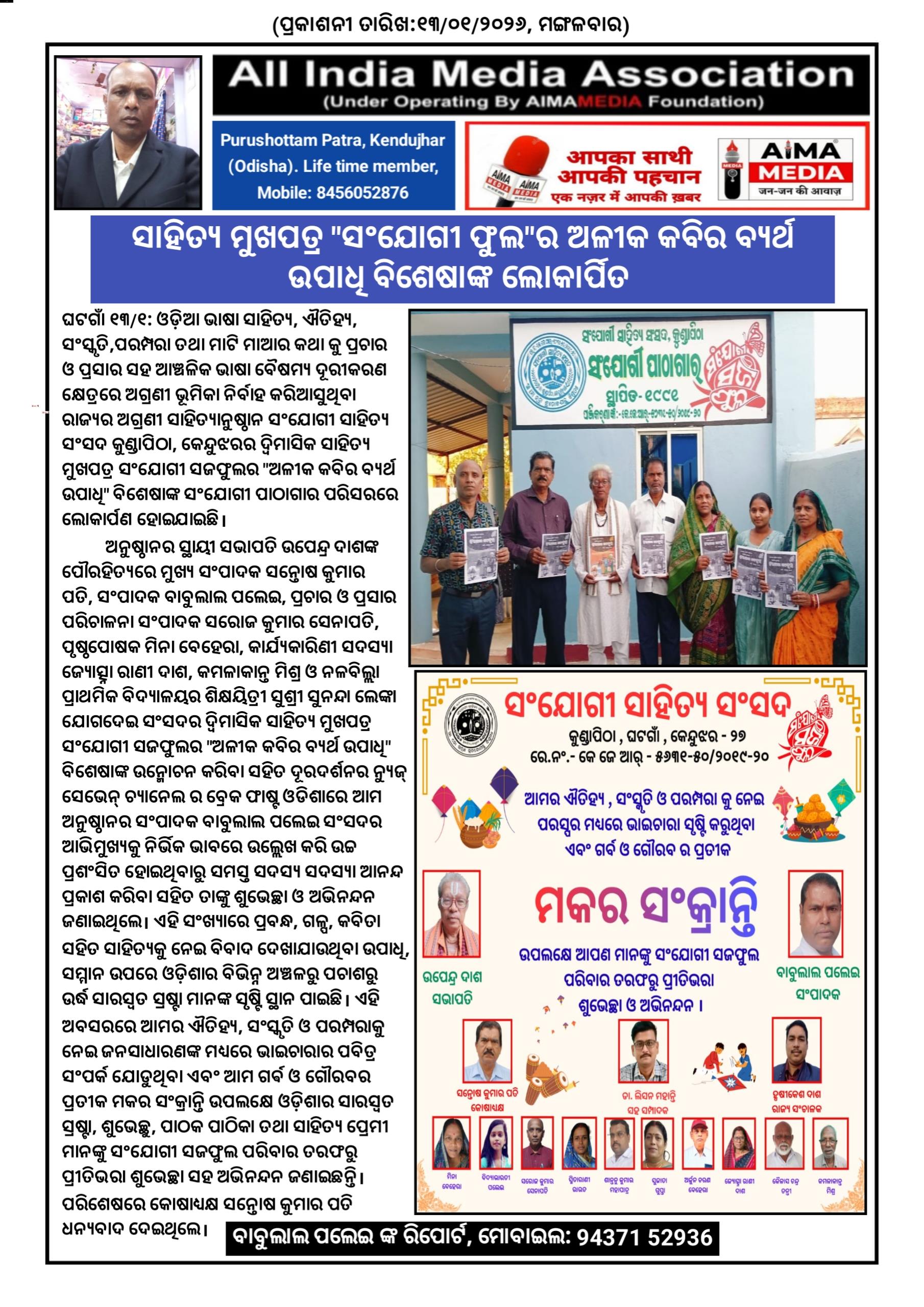 ଘଟଗାଁ ୧୩/୧: ଓଡ଼ିଆ ଭାଷା ସାହିତ୍ୟ, ଐତିହ୍ୟ, ସଂସ୍କୃତି,ପରମ୍ପରା ତଥା ମାଟି ମାଆର କଥା କୁ ପ୍ରଚାର ଓ ପ୍ରସାର ସହ ଆଞ୍ଚଳିକ ଭାଷା ବୈଷମ୍ୟ ଦୂରୀକରଣ କ୍ଷେତ୍ରରେ ଅଗ୍ରଣୀ ଭୂମିକା ନିର୍ବାହ କରିଆସୁଥିବା ରାଜ୍ୟର ଅଗ୍ରଣୀ ସାହିତ୍ଯାନୁଷ୍ଠାନ ସଂଯୋଗୀ ସାହିତ୍ୟ ସଂସଦ କୁଣ୍ଡାପିଠା, କେନ୍ଦୁଝରର ଦ୍ବିମାସିକ ସାହିତ୍ୟ ମୁଖପତ୍ର ସଂଯୋଗୀ ସଜଫୁଲର " ଅଳୀକ କବିର ବ୍ୟର୍ଥ ଉପାଧି " ବିଶେଷାଙ୍କ ସଂଯୋଗୀ ପାଠାଗାର ପରିସରରେ ଲୋକାର୍ପଣ ହୋଇଯାଇଛି।