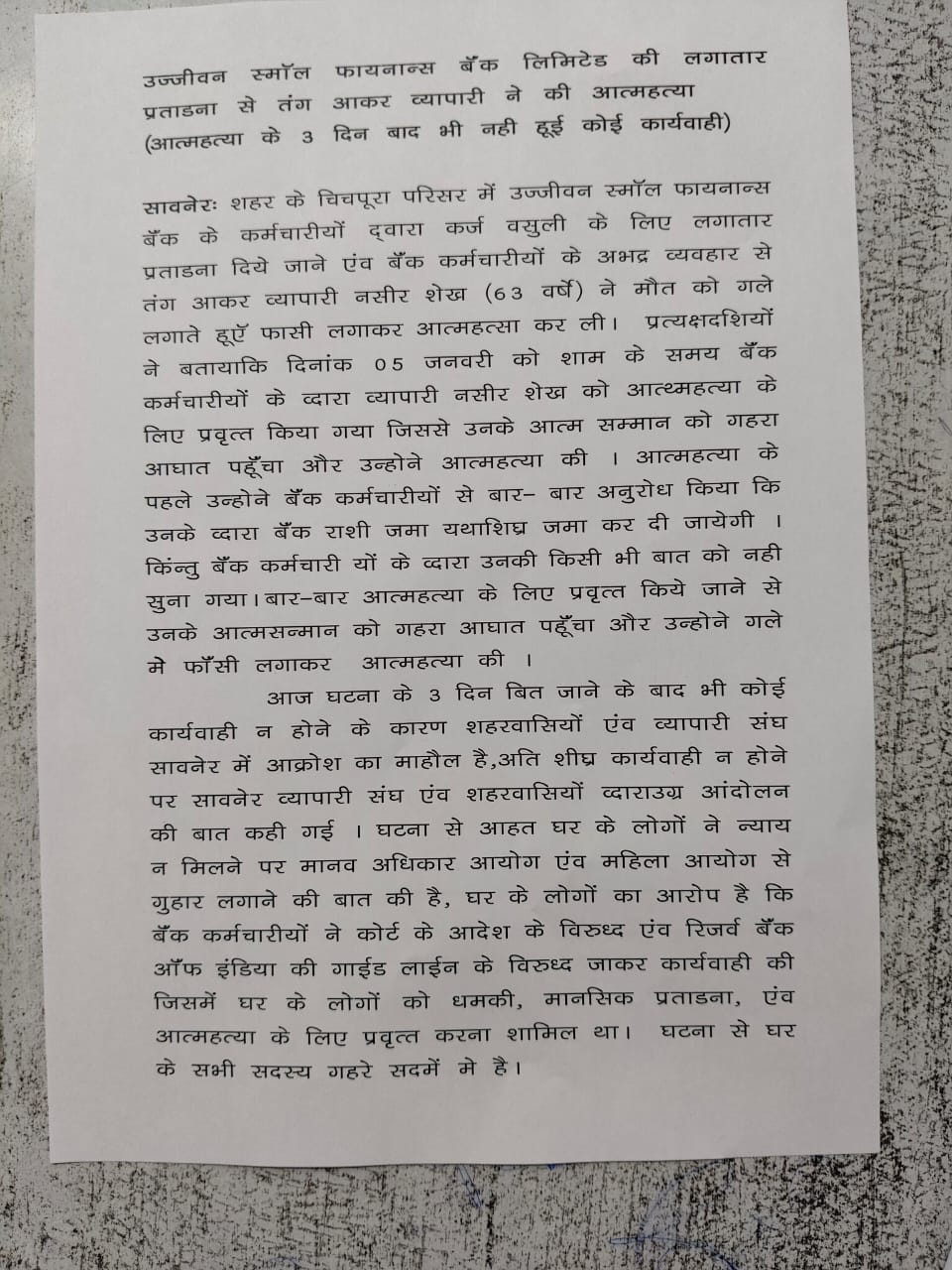 प्रेस नोट के अनुसार चीचपूरा परिसर मे उज्जीवन स्माल फाइनेंस बैंक के कर्मचारीयों द्वारा कर्ज वसूली के लिए लगातार प्रताड़ना दिए जाने एवं बैंक कर्मचारीयों के अभद्र व्यवहार से तंग आकर व्यापारी नसीर शेख उम्र 63 वर्ष ने मौत को गले लगाते हुए फांसी लगाकर आत्महत्या कर ली. प्रत्यक्षदर्शीयो ने बताया की 5 जनवरी 2026 को शाम के समय बैंक के कर्मचारीयों के द्वारा व्यापारी नसीर शेख को आत्महत्या करने के लिए मजबूर किया जबकि उनके द्वारा बार बार निवेदन किया गया की मै बकाया राशि जमा कर दूंगा लेकिन कर्मचारीयों द्वारा एक नहीं सुनी जिसके कारण आत्महत्या जैसा कदम उठाना पढ़ा.