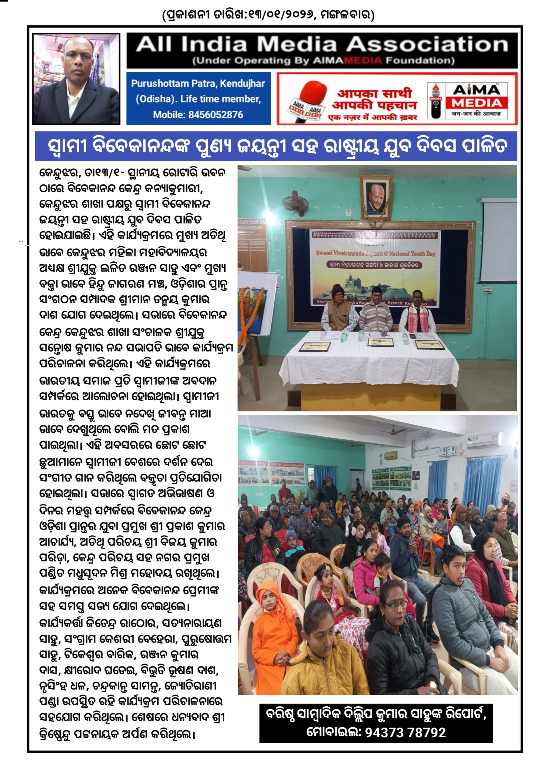 କେନ୍ଦୁଝର,ତା୧୩/୧- ସ୍ଥାନୀୟ ରୋଟାରି ଭବନ ଠାରେ ବିବେକାନନ୍ଦ କେନ୍ଦ୍ର କନ୍ୟାକୁମାରୀ, କେନ୍ଦୁଝର ଶାଖା ପକ୍ଷରୁ ସ୍ୱାମୀ ବିବେକାନନ୍ଦ ଜୟନ୍ତୀ ସହ ରାଷ୍ଟ୍ରୀୟ ଯୁବ ଦିବସ ପାଳିତ ହୋଇଯାଇଛି। ଏହି କାର୍ଯ୍ୟକ୍ରମରେ ମୁଖ୍ୟ ଅତିଥି ଭାବେ କେନ୍ଦୁଝର ମହିଳା ମହାବିଦ୍ୟାଳୟର ଅଧ୍ୟକ୍ଷ ଶ୍ରୀଯୁକ୍ତ ଲଳିତ ରଞ୍ଜନ ସାହୁ ଏବଂ ମୁଖ୍ୟ ବକ୍ତା ଭାବେ ହିନ୍ଦୁ ଜାଗରଣ ମଞ୍ଚ, ଓଡ଼ିଶାର ପ୍ରାନ୍ତ ସଂଗଠନ ସମ୍ପାଦକ ଶ୍ରୀମାନ ତନ୍ମୟ କୁମାର ଦାଶ ଯୋଗ ଦେଇଥିଲେ। ସଭାରେ ବିବେକାନନ୍ଦ କେନ୍ଦ୍ର କେନ୍ଦୁଝର ଶାଖା ସଂଚାଳକ ଶ୍ରୀଯୁକ୍ତ ସନ୍ତୋଷ କୁମାର ନନ୍ଦ ସଭାପତି ଭାବେ କାର୍ଯ୍ୟକ୍ରମ ପରିଚାଳନା କରିଥିଲେ। ଏହି କାର୍ଯ୍ୟକ୍ରମରେ ଭାରତୀୟ ସମାଜ ପ୍ରତି ସ୍ୱାମୀଜୀଙ୍କ ଅବଦାନ ସମ୍ପର୍କରେ ଆଲୋଚନା ହୋଇଥିଲା। ସ୍ୱାମୀଜୀ ଭାରତକୁ ବସ୍ତୁ ଭାବେ ନଦେଖି ଜୀବନ୍ତ ମାଆ ଭାବେ ଦେଖୁଥିଲେ ବୋଲି ମତ ପ୍ରକାଶ ପାଇଥିଲା। ଏହି ଅବସରରେ ଛୋଟ ଛୋଟ ଛୁଆମାନେ ସ୍ୱାମୀଜୀ ବେଶରେ ଦର୍ଶନ ଦେଇ ସଂଗୀତ ଗାନ କରିଥିଲେ ବକ୍ତୃତା ପ୍ରତିଯୋଗିତା ହୋଇଥିଲା। ସଭାରେ ସ୍ୱାଗତ ଅଭିଭାଷଣ ଓ ଦିନର ମହତ୍ତ୍ୱ ସମ୍ପର୍କରେ ବିବେକାନନ୍ଦ କେନ୍ଦ୍ର ଓଡ଼ିଶା ପ୍ରାନ୍ତର ଯୁବା ପ୍ରମୁଖ ଶ୍ରୀ ପ୍ରକାଶ କୁମାର ଆଚାର୍ଯ୍ୟ, ଅତିଥି ପରିଚୟ ଶ୍ରୀ ବିଜୟ କୁମାର ପରିଡ଼ା, କେନ୍ଦ୍ର ପରିଚୟ ସହ ନଗର ପ୍ରମୁଖ ପଣ୍ଡିତ ମଧୁସୂଦନ ମିଶ୍ର ମହୋଦୟ ରଖିଥିଲେ। କାର୍ଯ୍ୟକ୍ରମରେ ଅନେକ ବିବେକାନନ୍ଦ ପ୍ରେମୀଙ୍କ ସହ ସମସ୍ତ ସଭ୍ୟ ଯୋଗ ଦେଇଥିଲେ। କାର୍ଯ୍ୟକର୍ତ୍ତା ଜିତେନ୍ଦ୍ର ରାଠୋର, ସତ୍ୟନାରାୟଣ ସାହୁ, ସଂଗ୍ରାମ କେଶରୀ ବେହେରା, ପୁରୁଷୋତ୍ତମ ସାହୁ, ଟିକେଶ୍ୱର ବାରିକ, ରଞ୍ଜନ କୁମାର ଦାସ, କ୍ଷୀରୋଦ ଘଡେଇ, ବିଭୁତି ଭୂଷଣ ଦାଶ, ନୃସିଂହ ଧଳ, ଚନ୍ଦ୍ରକାନ୍ତ ସାମନ୍ତ, ଜ୍ୟୋତିରାଣୀ ପଣ୍ଡା ଉପସ୍ଥିତ ରହି କାର୍ଯ୍ୟକ୍ରମ ପରିଚାଳନାରେ ସହଯୋଗ କରିଥିଲେ। ଶେଷରେ ଧନ୍ୟବାଦ ଶ୍ରୀ କ୍ରିଷ୍ଣେନ୍ଦୁ ପଟ୍ଟନାୟକ ଅର୍ପଣ କରିଥିଲେ।