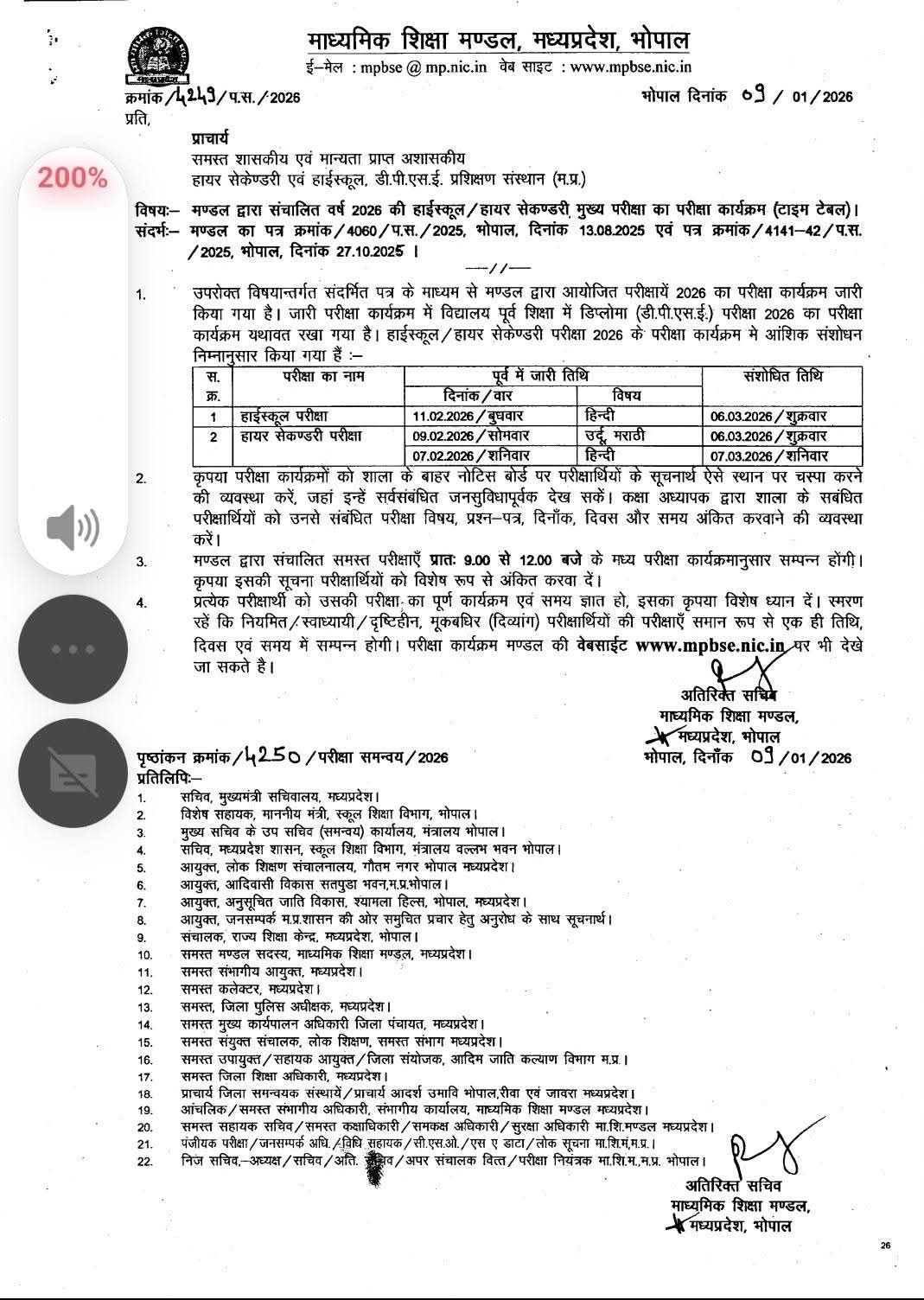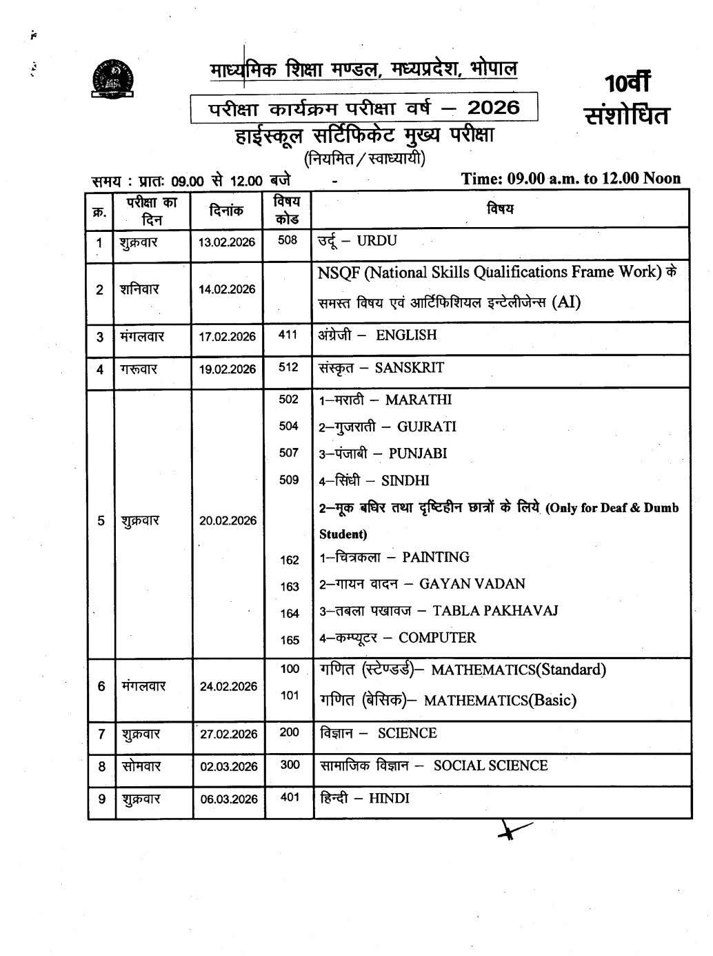 माध्यमिक शिक्षा मंडल, मध्यप्रदेश की हाई स्कूल एवं हायर सेकंडरी परीक्षा के कार्यक्रम में आंशिक संशोधन