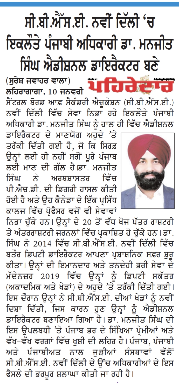 लेहरागागा, 10 जनवरी (सुरेश जवाहर वाला 90233-63132) सेंट्रल बोर्ड ऑफ सेकेंडरी एजुकेशन (CBSE) नई दिल्ली में सेवा दे रहे इकलौते पंजाबी ऑफिसर डॉ. मनजीत सिंह को हाल ही में एडिशनल डायरेक्टर के सम्मानजनक पद पर प्रमोट किया गया है, जो न सिर्फ उनके लिए बल्कि पूरे पंजाब के लिए गर्व की बात है।