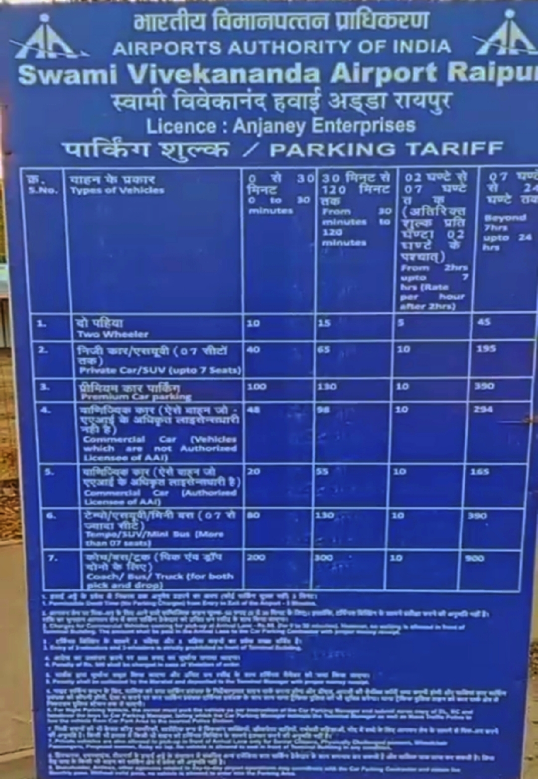 नमस्ते! यह स्वामी विवेकानंद एयरपोर्ट, रायपुर (Swami Vivekananda Airport, Raipur) की आधिकारिक पार्किंग रेट लिस्ट है।