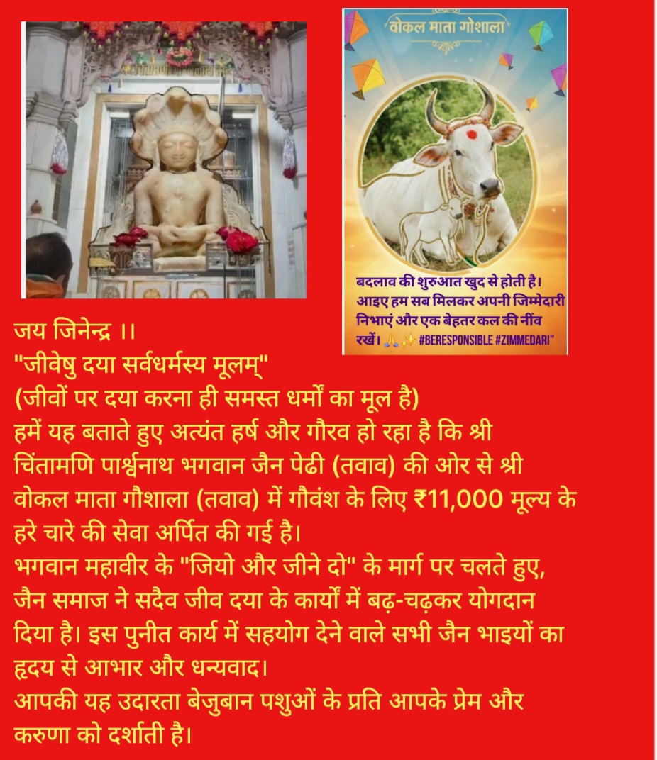 मकर संक्रांति के पावन पर्व पर जहाँ लोग दान-पुण्य में व्यस्त थे, वहीं तवाव गाँव के युवाओं और समस्त ग्रामीणों ने मिलकर सामाजिक सरोकार की एक नई इबारत लिखी है। श्री वोकल माता गौशाला में आज सामूहिक सहयोग से उन बेसहारा नंदी और छोटे बछड़ों के लिए विशेष व्यवस्था की गई, जो अब तक सड़कों पर लावारिस घूमने को मजबूर थे।