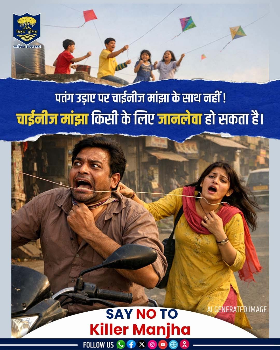 मैं उन सभी गार्जियनों से अनुरोध करता हूं जो अपने बच्चों को खुशी-खुशी पतंग उड़ाने के लिए पैसे देते हैं पर यह ध्यान रखना भूल जाते हैं कि बच्चे हमारे जो धागा का प्रयोग करते हैं वह धागा चाइनीज होता है जिससे वह बाइक सवार जा रहे कोई भी हो सकता है कोई भी राहगीर या साइकिल से जा रहे कोई भी राहगीर के गले पर लगने से उसके गले कट जाने का पूरा संभावना रहता है इसलिए कृपया करके सतर्क रहे सावधानी बरते और दूसरों को भी समझाएं 🙏🏻