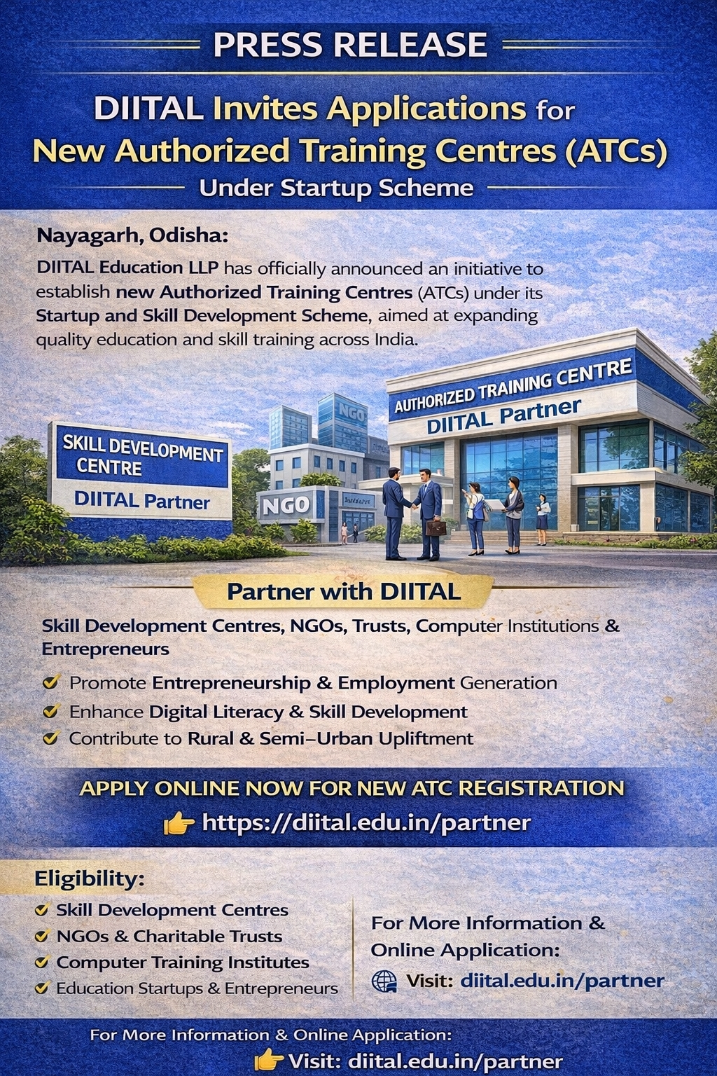 DIITAL Education LLP has officially announced an invitation to establish new Authorized Training Centres (ATCs) under its Startup and Skill Development Scheme, aimed at expanding quality education and skill training across India.