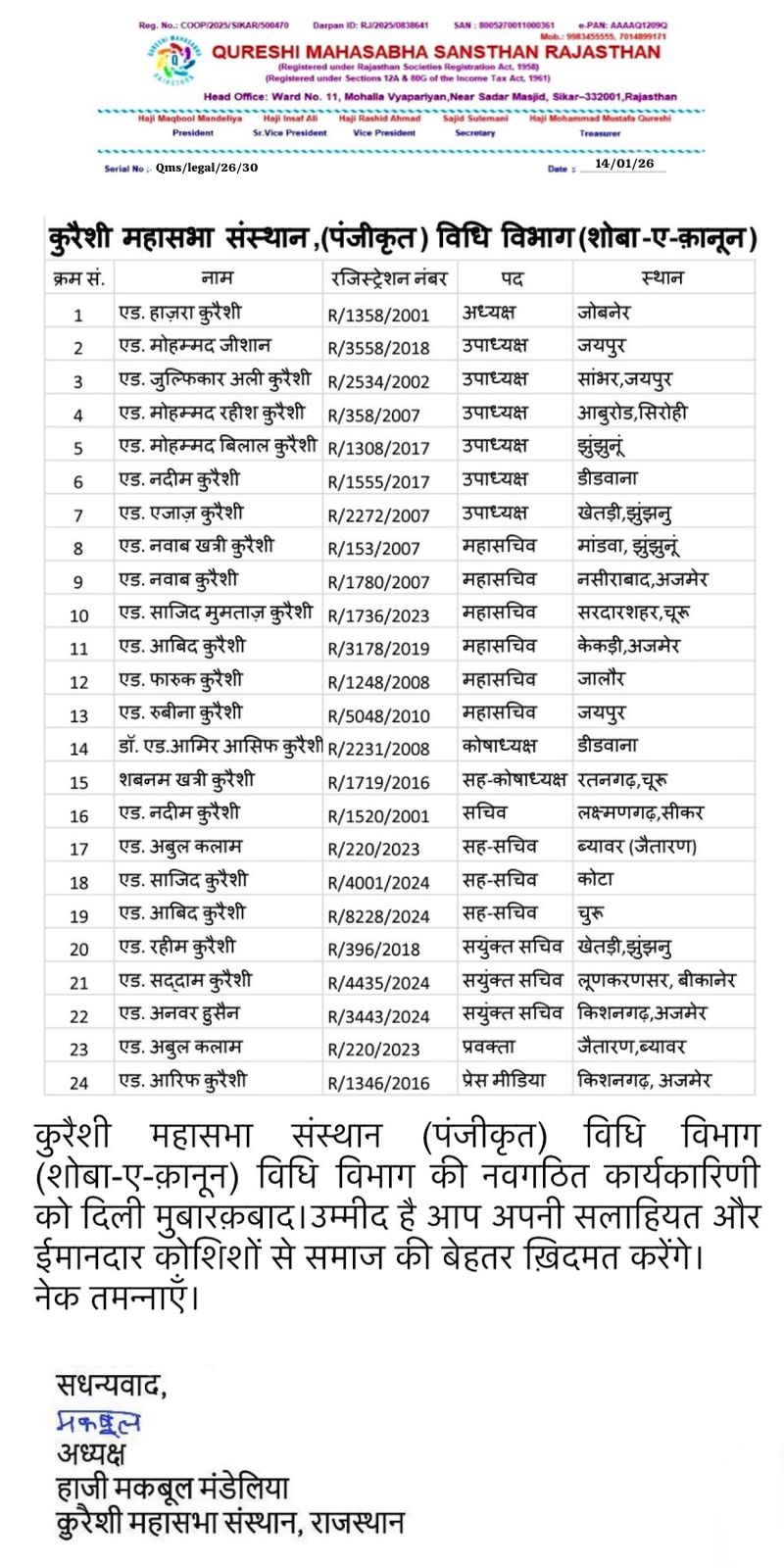 कुरैशी महासभा संस्थान (पंजीकृत), राजस्थान के विधि विभाग (शोबा-ए-क़ानून) की नवगठित प्रदेश कार्यकारिणी की घोषणा कर दी गई है। इस अवसर पर समाज में उत्साह और सकारात्मक उम्मीदों का वातावरण बना हुआ है। समाज के विभिन्न वर्गों द्वारा नवगठित कार्यकारिणी को दिल की गहराइयों से मुबारक़बाद और नेक ख़्वाहिशात पेश की जा रही हैं।