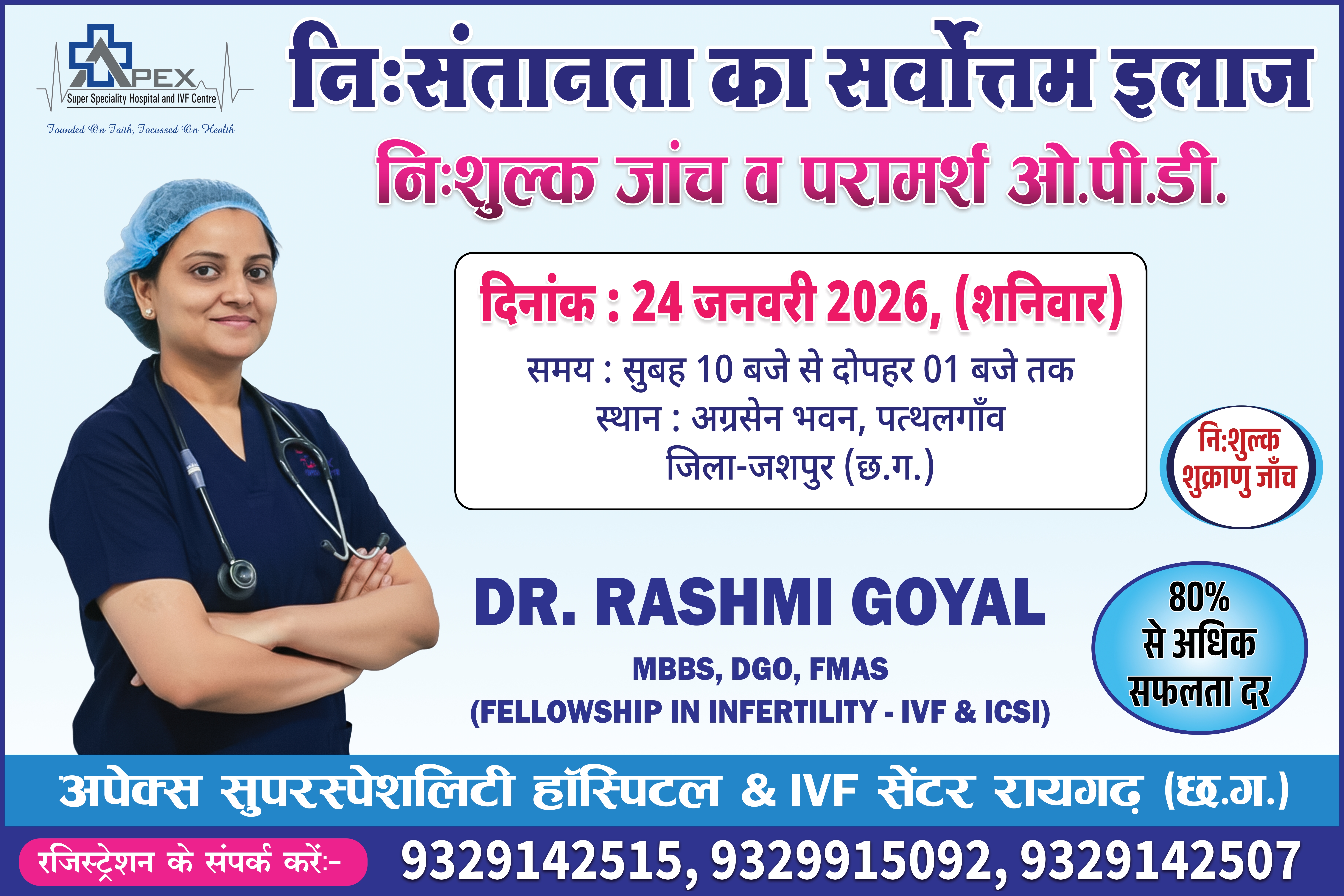 अपेक्स सुपरस्पेशलिटी हॉस्पिटल एवम् आईवीएफ सेंटर रायगढ़ द्वारा आयोजित, निःसंतान दंपतियों के लिए निःशुल्क जांच एवम् परामर्श ओपीडी का आयोजन दिनांक 24 जनवरी 2026, दिन शनिवार को अग्रसेन भवन, पत्थलगांव,जिला - जशपुर (छत्तीसगढ़) मे किया जा रहा है जिसमे इनफर्टिलिटी विशेषज्ञ डॉ रश्मि गोयल,निःशुल्क जांच एवम् परमर्श हेतु उपलब्ध रहेंगी।