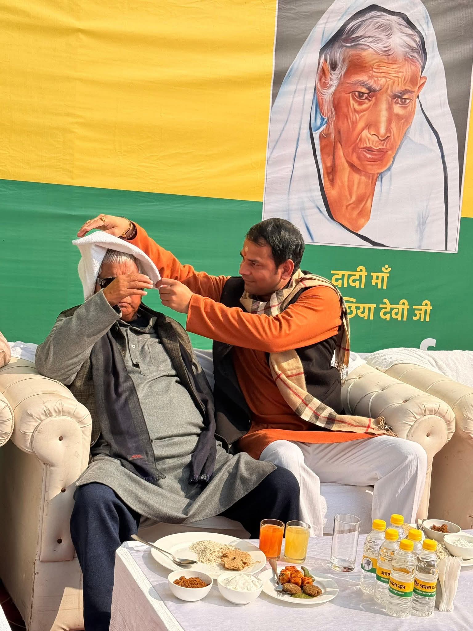 भोज के दौरान एक और सियासी संदेश चर्चा में रहा। वीवीआईपी बैठने की जगह के पीछे तेज प्रताप की पार्टी का बड़ा बैनर, उस पर दादी की तस्वीर और सामने मौजूद लालू—सब कुछ मिलकर राजनीतिक संकेत दे रहा था। वहीं तेज प्रताप ने पिता के सिर पर तौलिया रखकर रिश्तों की गर्माहट भी दिखाई।