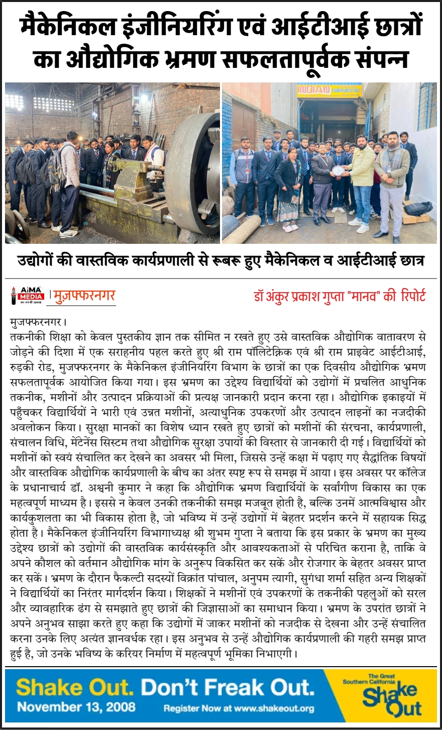 तकनीकी शिक्षा को केवल पुस्तकीय ज्ञान तक सीमित न रखते हुए उसे वास्तविक औद्योगिक वातावरण से जोड़ने की दिशा में एक सराहनीय पहल करते हुए श्री राम पॉलिटेक्निक एवं श्री राम प्राइवेट आईटीआई, रुड़की रोड, मुजफ्फरनगर के मैकेनिकल इंजीनियरिंग विभाग के छात्रों का एक दिवसीय औद्योगिक भ्रमण सफलतापूर्वक आयोजित किया गया। इस भ्रमण का उद्देश्य विद्यार्थियों को उद्योगों में प्रचलित आधुनिक तकनीक, मशीनों और उत्पादन प्रक्रियाओं की प्रत्यक्ष जानकारी प्रदान करना रहा। औद्योगिक इकाइयों में पहुँचकर विद्यार्थियों ने भारी एवं उन्नत मशीनों, अत्याधुनिक उपकरणों और उत्पादन लाइनों का नजदीकी अवलोकन किया। सुरक्षा मानकों का विशेष ध्यान रखते हुए छात्रों को मशीनों की संरचना, कार्यप्रणाली, संचालन विधि, मेंटेनेंस सिस्टम तथा औद्योगिक सुरक्षा उपायों की विस्तार से जानकारी दी गई। विद्यार्थियों को मशीनों को स्वयं संचालित कर देखने का अवसर भी मिला, जिससे उन्हें कक्षा में पढ़ाए गए सैद्धांतिक विषयों और वास्तविक औद्योगिक कार्यप्रणाली के बीच का अंतर स्पष्ट रूप से समझ में आया। इस अवसर पर कॉलेज के प्रधानाचार्य डॉ. अश्वनी कुमार ने कहा कि औद्योगिक भ्रमण विद्यार्थियों के सर्वांगीण विकास का एक महत्वपूर्ण माध्यम है। इससे न केवल उनकी तकनीकी समझ मजबूत होती है, बल्कि उनमें आत्मविश्वास और कार्यकुशलता का भी विकास होता है, जो भविष्य में उन्हें उद्योगों में बेहतर प्रदर्शन करने में सहायक सिद्ध होता है। मैकेनिकल इंजीनियरिंग विभागाध्यक्ष श्री शुभम गुप्ता ने बताया कि इस प्रकार के भ्रमण का मुख्य उद्देश्य छात्रों को उद्योगों की वास्तविक कार्यसंस्कृति और आवश्यकताओं से परिचित कराना है, ताकि वे अपने कौशल को वर्तमान औद्योगिक मांग के अनुरूप विकसित कर सकें और रोजगार के बेहतर अवसर प्राप्त कर सकें। भ्रमण के दौरान फैकल्टी सदस्यों विक्रांत पांचाल, अनुपम त्यागी, सुगंधा शर्मा सहित अन्य शिक्षकों ने विद्यार्थियों का निरंतर मार्गदर्शन किया। शिक्षकों ने मशीनों एवं उपकरणों के तकनीकी पहलुओं को सरल और व्यावहारिक ढंग से समझाते हुए छात्रों की जिज्ञासाओं का समाधान किया। भ्रमण के उपरांत छात्रों ने अपने अनुभव साझा करते हुए कहा कि उद्योगों में जाकर मशीनों को नजदीक से देखना और उन्हें संचालित करना उनके लिए अत्यंत ज्ञानवर्धक रहा। इस अनुभव से उन्हें औद्योगिक कार्यप्रणाली की गहरी समझ प्राप्त हुई है, जो उनके भविष्य के करियर निर्माण में महत्वपूर्ण भूमिका निभाएगी।
