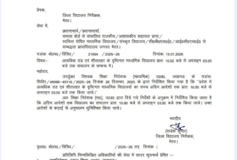 *मेरठ, उत्तर प्रदेश:* ठंड और शीतलहर को देखते हुए मेरठ के सभी माध्यमिक स्कूलों का समय बदल दिया गया है। अब सभी स्कूल सुबह 10 बजे से दोपहर 3 बजे तक चलेंगे। यह आदेश अगले निर्देश तक लागू रहेगा। सभी स्कूलों को इसका पालन करना होगा।