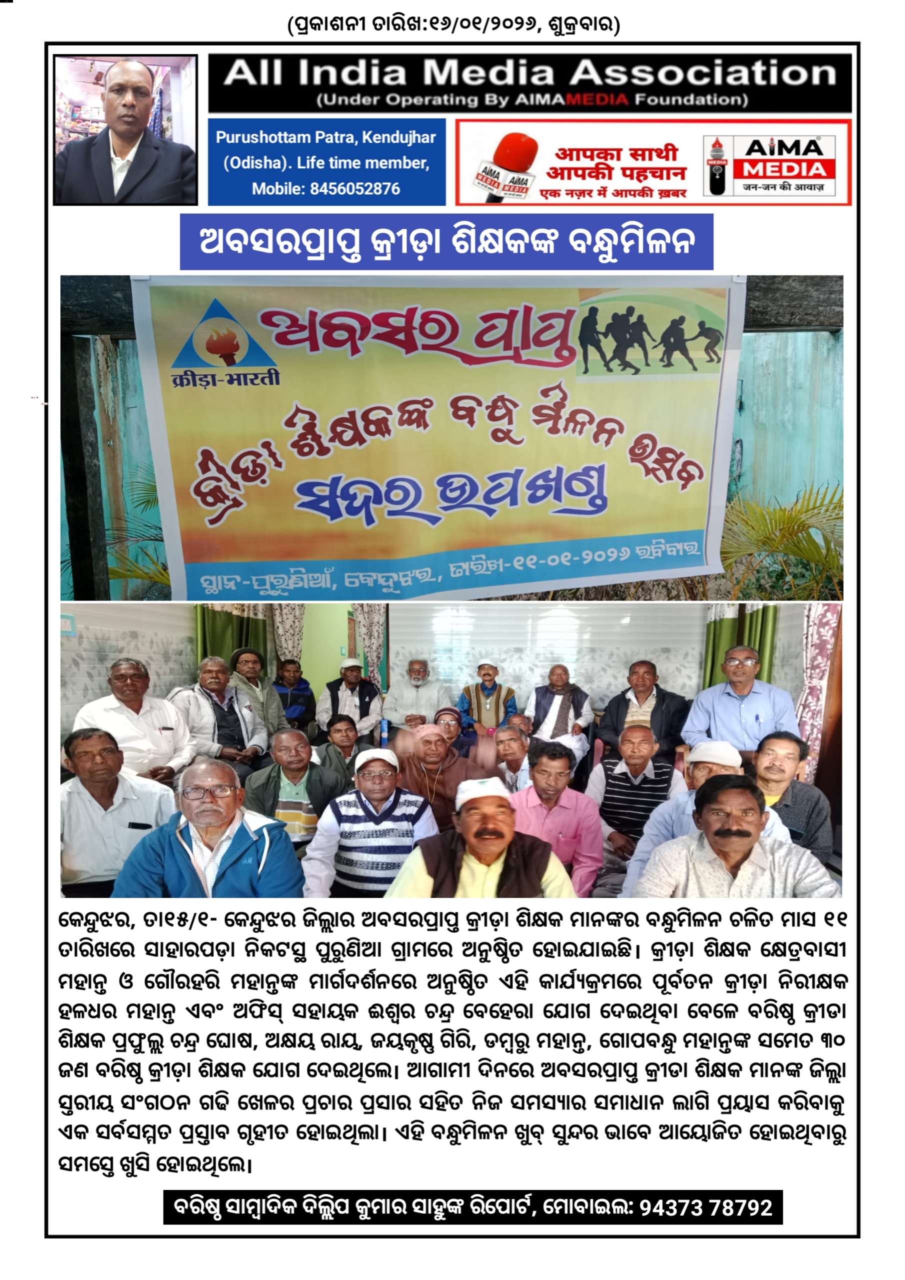 କେନ୍ଦୁଝର,ତା୧୫/୧- କେନ୍ଦୁଝର ଜିଲ୍ଲାର ଅବସରପ୍ରାପ୍ତ କ୍ରୀଡ଼ା ଶିକ୍ଷକ ମାନଙ୍କର ବନ୍ଧୁମିଳନ ଚଳିତ ମାସ ୧୧ ତାରିଖରେ ସାହାରପଡ଼ା ନିକଟସ୍ଥ ପୁରୁଣିଆ ଗ୍ରାମରେ ଅନୁଷ୍ଠିତ ହୋଇଯାଇଛି । କ୍ରୀଡ଼ା ଶିକ୍ଷକ କ୍ଷେତ୍ରବାସୀ ମହାନ୍ତ ଓ ଗୌରହରି ମହାନ୍ତଙ୍କ ମାର୍ଗଦର୍ଶନରେ ଅନୁଷ୍ଠିତ ଏହି କାର୍ଯ୍ୟକ୍ରମରେ ପୂର୍ବତନ କ୍ରୀଡ଼ା ନିରୀକ୍ଷକ ହଳଧର ମହାନ୍ତ ଏବଂ ଅଫିସ୍ ସହାୟକ ଈଶ୍ଵର ଚନ୍ଦ୍ର ବେହେରା ଯୋଗ ଦେଇଥିବା ବେଳେ ବରିଷ୍ଠ କ୍ରୀଡା ଶିକ୍ଷକ ପ୍ରଫୁଲ୍ଲ ଚନ୍ଦ୍ର ଘୋଷ, ଅକ୍ଷୟ ରାୟ, ଜୟକୃଷ୍ଣ ଗିରି, ଡମ୍ବରୁ ମହାନ୍ତ, ଗୋପବନ୍ଧୁ ମହାନ୍ତଙ୍କ ସମେତ ୩୦ ଜଣ ବରିଷ୍ଠ କ୍ରୀଡ଼ା ଶିକ୍ଷକ ଯୋଗ ଦେଇଥିଲେ। ଆଗାମୀ ଦିନରେ ଅବସରପ୍ରାପ୍ତ କ୍ରୀଡା ଶିକ୍ଷକ ମାନଙ୍କ ଜିଲ୍ଲା ସ୍ତରୀୟ ସଂଗଠନ ଗଢି ଖେଳର ପ୍ରଚାର ପ୍ରସାର ସହିତ ନିଜ ସମସ୍ୟାର ସମାଧାନ ଲାଗି ପ୍ରୟାସ କରିବାକୁ ଏକ ସର୍ବସମ୍ମତ ପ୍ରସ୍ତାବ ଗୃହୀତ ହୋଇଥିଲା। ଏହି ବନ୍ଧୁମିଳନ ଖୁବ୍ ସୁନ୍ଦର ଭାବେ ଆୟୋଜିତ ହୋଇଥିବାରୁ ସମସ୍ତେ ଖୁସି ହୋଇଥିଲେ ।