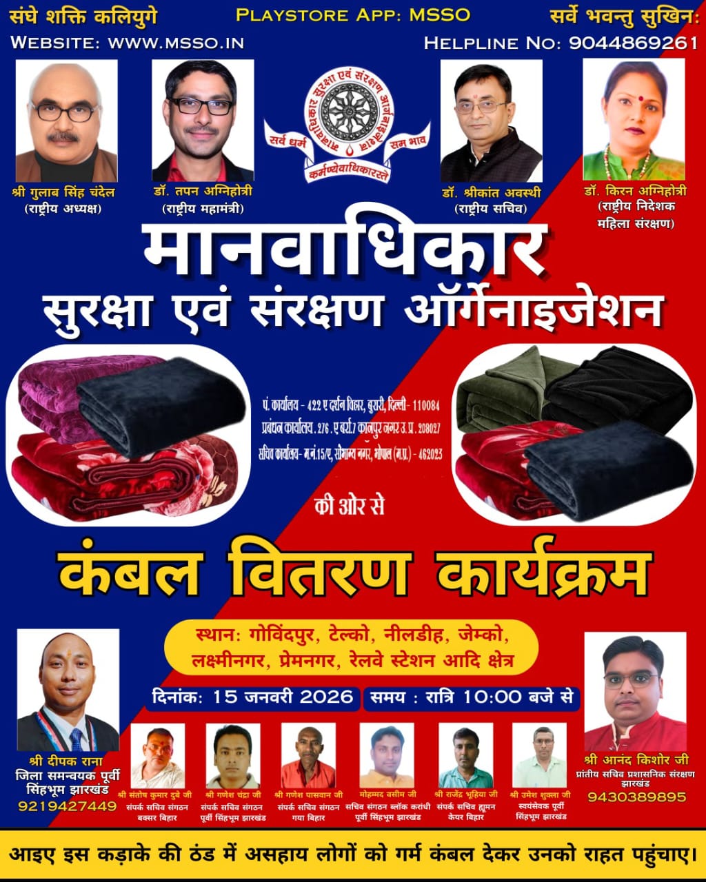 मानवाधिकार सुरक्षा एवं संरक्षण संगठन के तत्वावधान में दिनांक 15 जनवरी 2026 को जमशेदपुर शहर में एक विशेष रात्रिकालीन सेवा अभियान का सफल आयोजन किया गया। यह सेवा अभियान रात्रि 10:00 बजे गोविंदपुर से प्रारंभ होकर टेल्को, नीलडीह, जेम्को, लक्ष्मीनगर, प्रेमनगर, रेलवे स्टेशन होते हुए साकची तक संचालित किया गया, जो सुबह 4:00 बजे तक निरंतर चला।