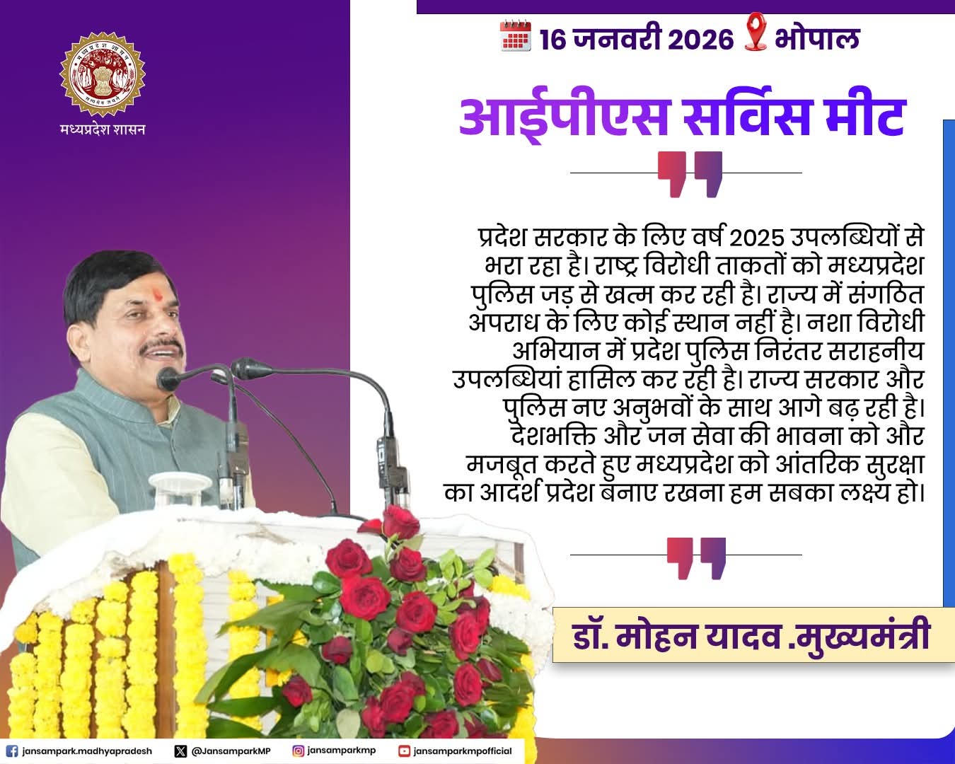 प्रदेश सरकार के लिए वर्ष 2025 उपलब्धियों से भरा रहा है। राष्ट्र विरोधी ताकतों को मध्यप्रदेश पुलिस जड़ से खत्म कर रही है। राज्य में संगठित अपराध के लिए कोई स्थान नहीं है। नशा विरोधी अभियान में प्रदेश पुलिस निरंतर सराहनीय उपलब्धियां हासिल कर रही है। राज्य सरकार और पुलिस नए अनुभवों के साथ आगे बढ़ रही है। देशभक्ति और जन सेवा की भावना को और मजबूत करते हुए मध्यप्रदेश को आंतरिक सुरक्षा का आदर्श प्रदेश बनाए रखना हम सबका लक्ष्य हो।