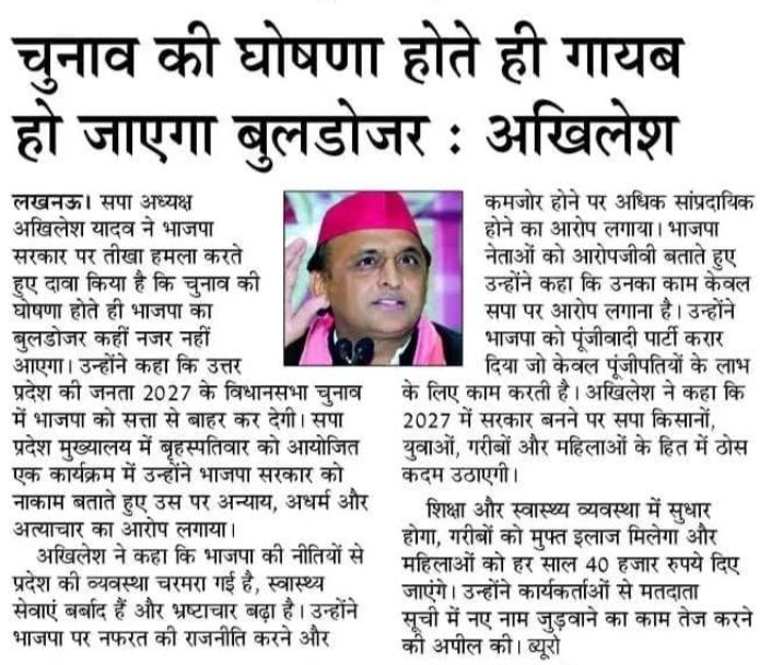 चुनाव की घोषणा होते ही गायब हो जायेंगा बुलडोजर :- अखिलेश यादव