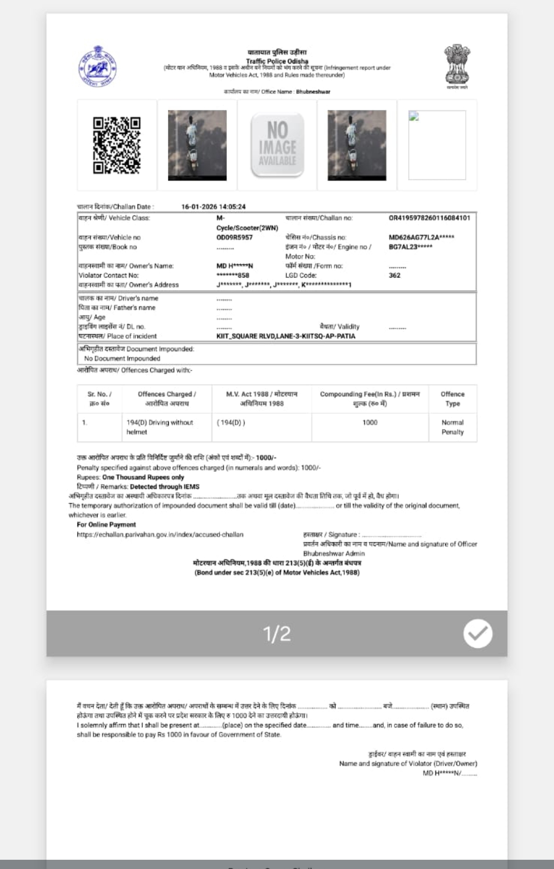 स्कूटी का रजिस्ट्रेशन नंबर OD09R5957 है, जो झूमपुरा, जिला केन्दुझर (Odisha) में पंजीकृत है। दिनांक 16/01/2026 को मेरे मोबाइल पर ₹1000 का चालान (बिना हेलमेट) का संदेश प्राप्त हुआ, जबकि मेरी स्कूटी उस समय घर पर खड़ी थी और भूबनेश्वर में नहीं थी।