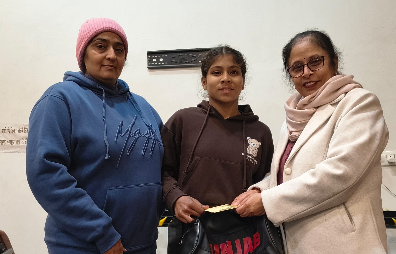 ਫੋਟੋ: ਸਰਕਾਰੀ ਹਾਈ ਸਕੂਲ ਭਾਣਾ,ਫਰੀਦਕੋਟ ਦੀ ਖਿਡਾਰਨ ਗੁਰਨੂਰ ਨੂੰ ਰਾਸ਼ਟਰੀ ਖੇਡਾਂ ਵਿੱਚ ਭਾਗ ਲੈਣ ਲਈ ਰਵਾਨਾ ਕਰਨ ਮੌਕੇ ਨਕਦ ਰਾਸ਼ੀ ਨਾਲ ਸ਼ੁਭਕਾਮਨਾਵਾਂ ਦੇ ਕੇ ਸਨਮਾਨਿਤ ਕਰਦੇ ਹੋਏ ਸਕੂਲ ਮੁਖੀ ਸ਼੍ਰੀਮਤੀ ਅਨੀਤਾ ਅਰੋੜਾ ਨਾਲ ਡੀ.ਪੀ. ਈ.ਸੁਖਵੰਤ ਕੌਰ