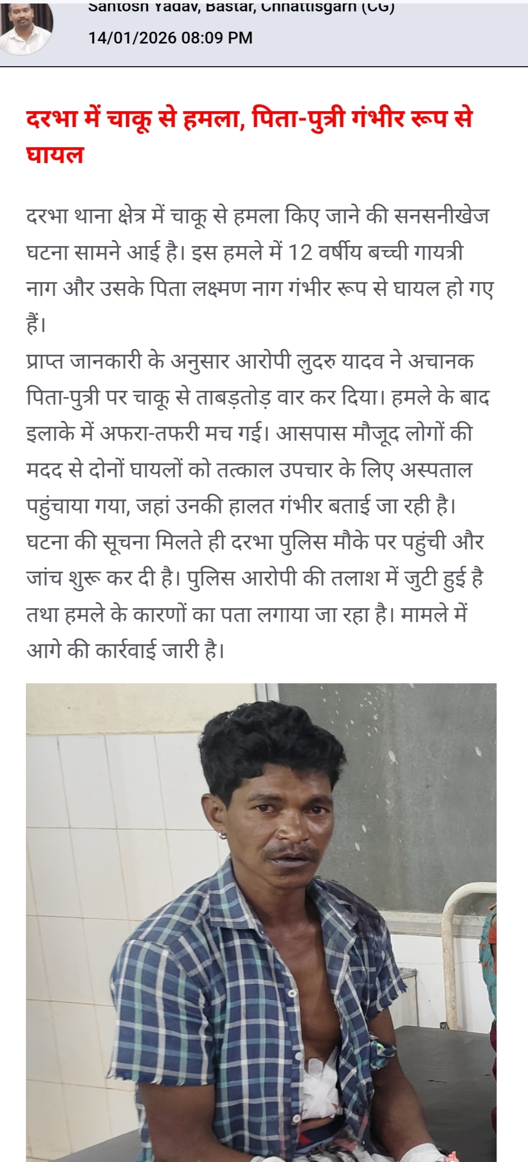 दरभा में चाकू से हमला: पिता-पुत्री गंभीर रूप से घायल, एमएलसी में देरी से गिरफ्तारी अधर में