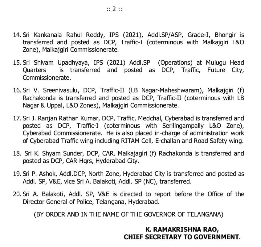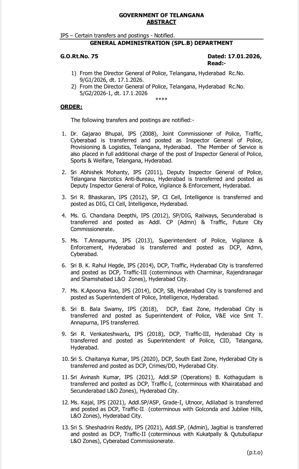 తెలంగాణ రాష్ట్రంలో ప్రభుత్వం భారీ ఎత్తున ఐపీఎస్‌ అధికారుల బదిలీలు చేపట్టింది. కీలక విభాగాల్లో అనుభవం కలిగిన అధికారులతో పాటు యువ ఐపీఎస్‌లకు కూడా ప్రాధాన్యతనిస్తూ కొత్త బాధ్యతలు అప్పగించింది.