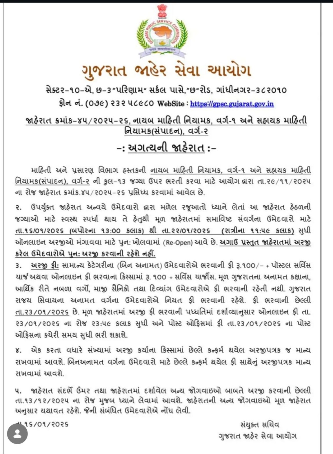 ગુજરાત જાહેર સેવા આયોગ દ્વારા આયોજિત જાહેરાત ક્રમાંક ૪૫/૨૦૨૫-૨૬