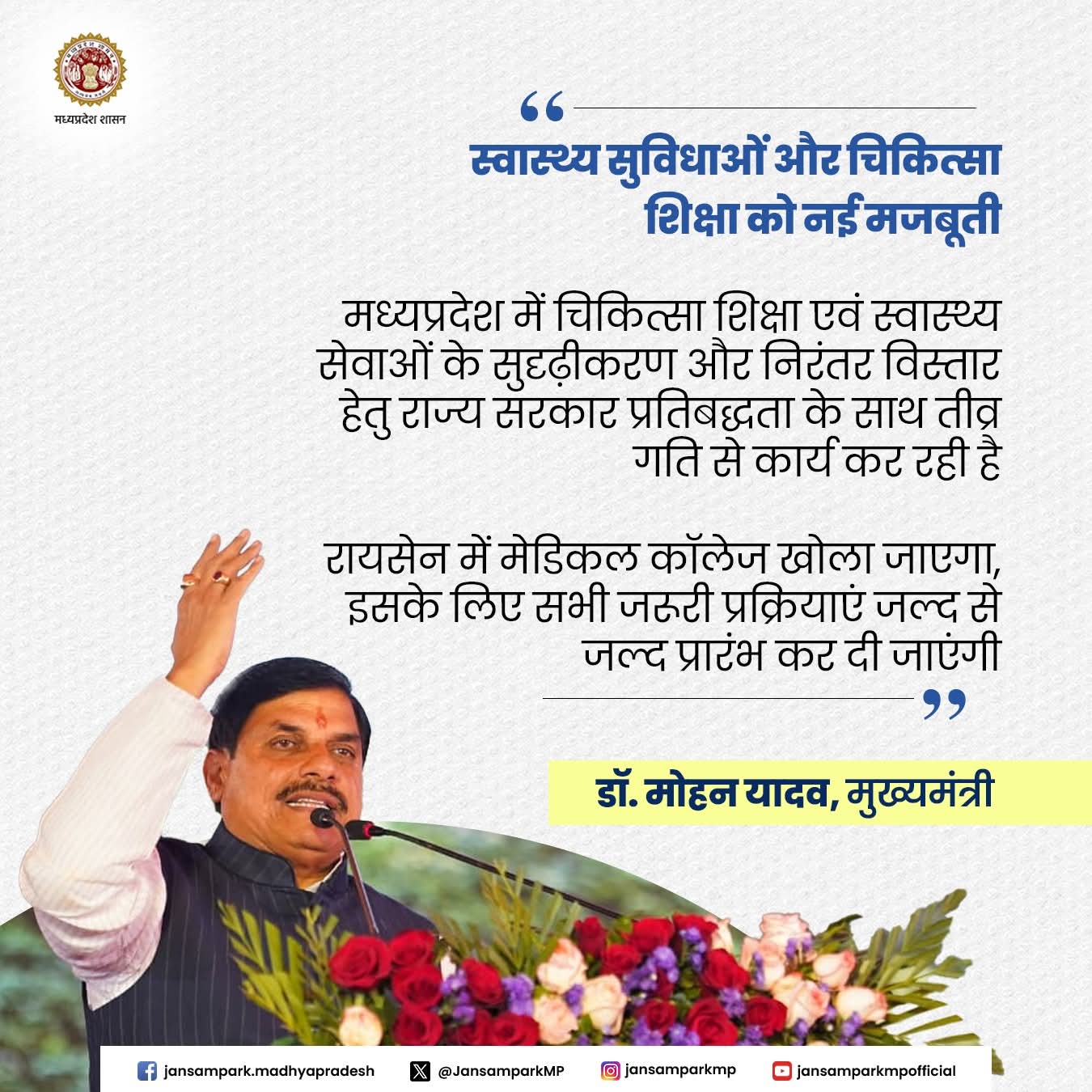 मध्यप्रदेश में चिकित्सा शिक्षा एवं स्वास्थ्य सेवाओं के सुदृढ़ीकरण और निरंतर विस्तार हेतु राज्य सरकार प्रतिबद्धता के साथ तीव्र गति से कार्य कर रही है।