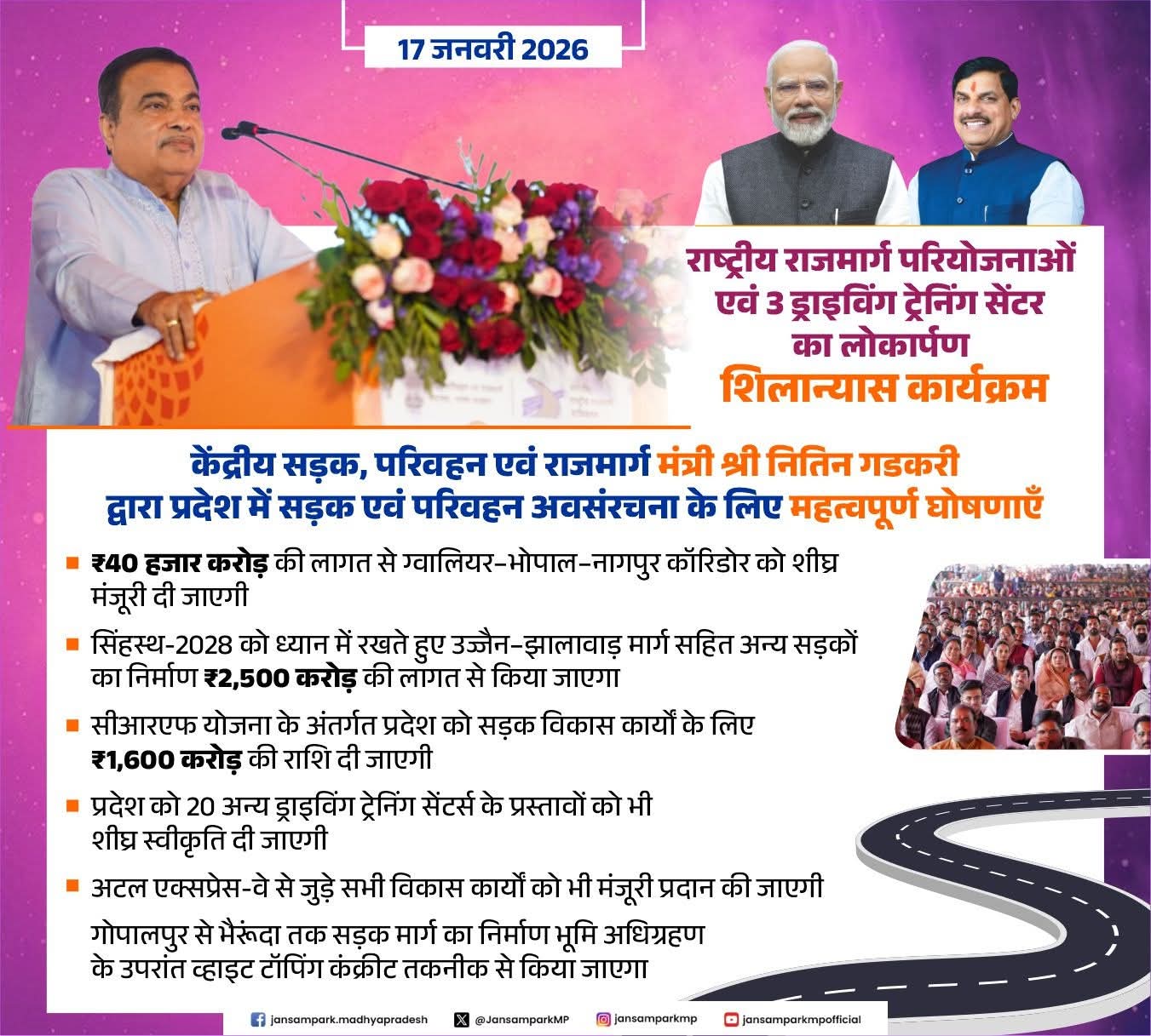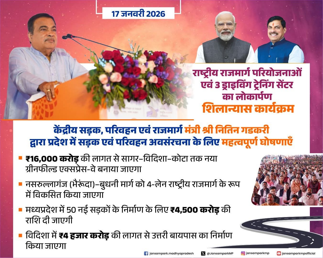 केंद्रीय सड़क, परिवहन एवं राजमार्ग मंत्री श्री नितिन गडकरी द्वारा प्रदेश में सड़क एवं परिवहन अवसंरचना के लिए महत्वपूर्ण घोषणाएँ