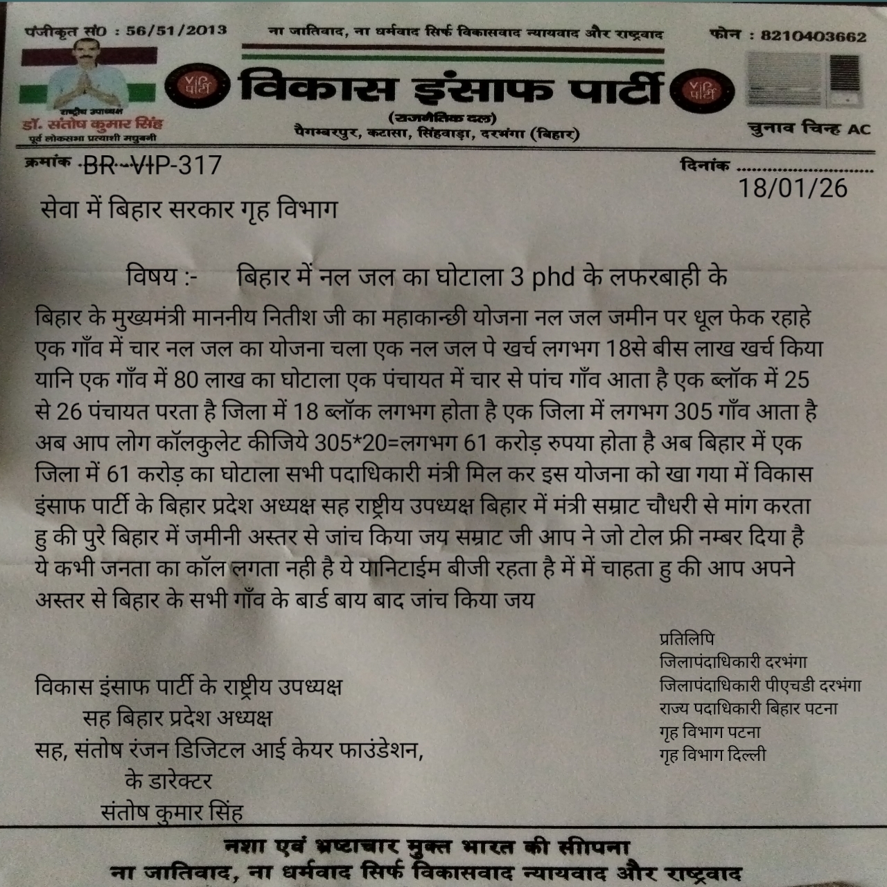 बिहार के मुख्यमंत्री माननीय नितीश जी का महाकान्छी योजना नल जल जमीन पर धूल फेक रहाहे एक गाँव में चार नल जल का योजना चला एक नल जल पे खर्च लगभग 18से बीस लाख खर्च किया यानि एक गाँव में 80 लाख का घोटाला एक पंचायत में चार से पांच गाँव आता है एक ब्लॉक में 25 से 26 पंचायत परता है जिला में 18 ब्लॉक लगभग होता है एक जिला में लगभग 305 गाँव आता है अब आप लोग कॉलकुलेट कीजिये 305*20=लगभग 61 करोड़ रुपया होता है अब बिहार में एक जिला में 61 करोड़ का घोटाला सभी पदाधिकारी मंत्री मिल कर इस योजना को खा गया में विकास इंसाफ पार्टी के बिहार प्रदेश अध्यक्ष सह राष्ट्रीय उपध्यक्ष बिहार में मंत्री सम्राट चौधरी से मांग करता हु की पुरे बिहार में जमीनी अस्तर से जांच किया जय सम्राट जी आप ने जो टोल फ्री नम्बर दिया है ये कभी जनता का कॉल लगता नही है ये यानिटाईम बीजी रहता है में में चाहता हु की आप अपने अस्तर से बिहार के सभी गाँव के बार्ड बाय बाद जांच किया जय