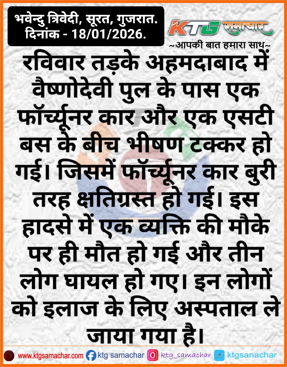 रविवार तड़के अहमदाबाद में वैष्णो देवी पुल के पास एक फॉर्च्यून कार और एक एसटी बस के बीच भीषण टक्कर हो गई।