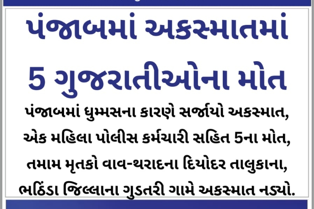 પંજાબમાં ધુમ્મસના કારણે સર્જાયો અકસ્માત, એક મહિલા પોલીસ કર્મચારી સહિત 5ના મોત, તમામ મૃતકો વાવ-થરાદના દિયોદર તાલુકાના, ભઠિંડા જિલ્લાના ગુડતરી ગામે અકસ્માત નડ્યો.