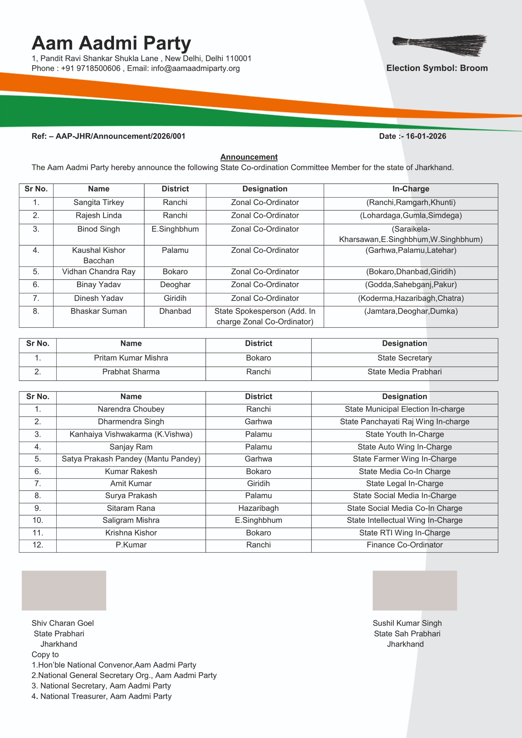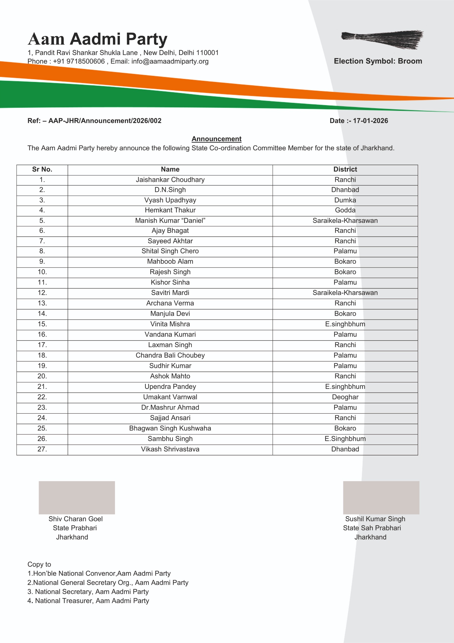 आम आदमी पार्टी झारखंड की 47 सदस्यीय प्रदेश समन्वय समिति घोषित की गयी....