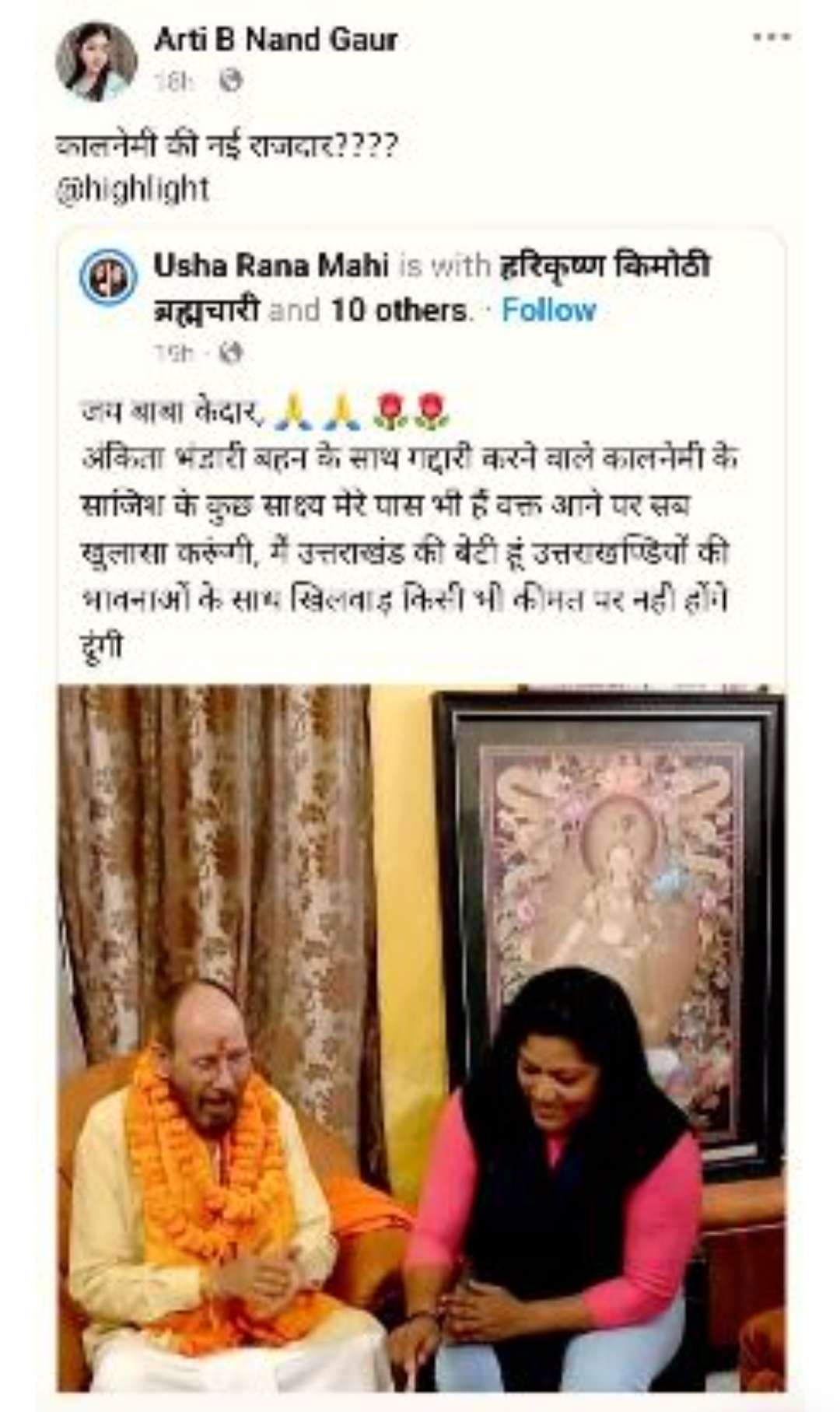 अपने पोस्ट में उषा राणा माही ने लिखा कि वह उत्तराखंड की बेटी हैं और राज्य की जनता की भावनाओं के साथ किसी भी तरह का खिलवाड़ बर्दाश्त नहीं करेंगी। उन्होंने यह भी दावा किया कि अंकिता भंडारी के साथ “गद्दारी करने वालों” की साजिश से जुड़े कुछ प्रमाण उनके पास मौजूद हैं।