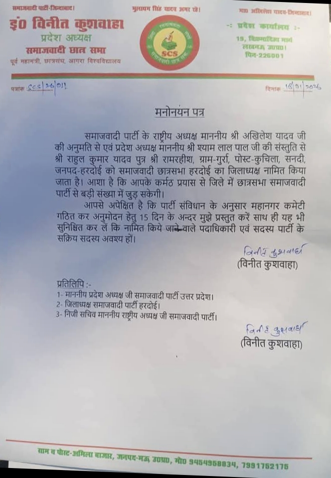 अध्यक्ष विनीत कुशवाहा ने किया मनोनयन, सपा कार्यकर्ताओं, नेताओं व शुभचिंतकों में खुशी की लहर, बधाई देने वालों का लगा तांता...