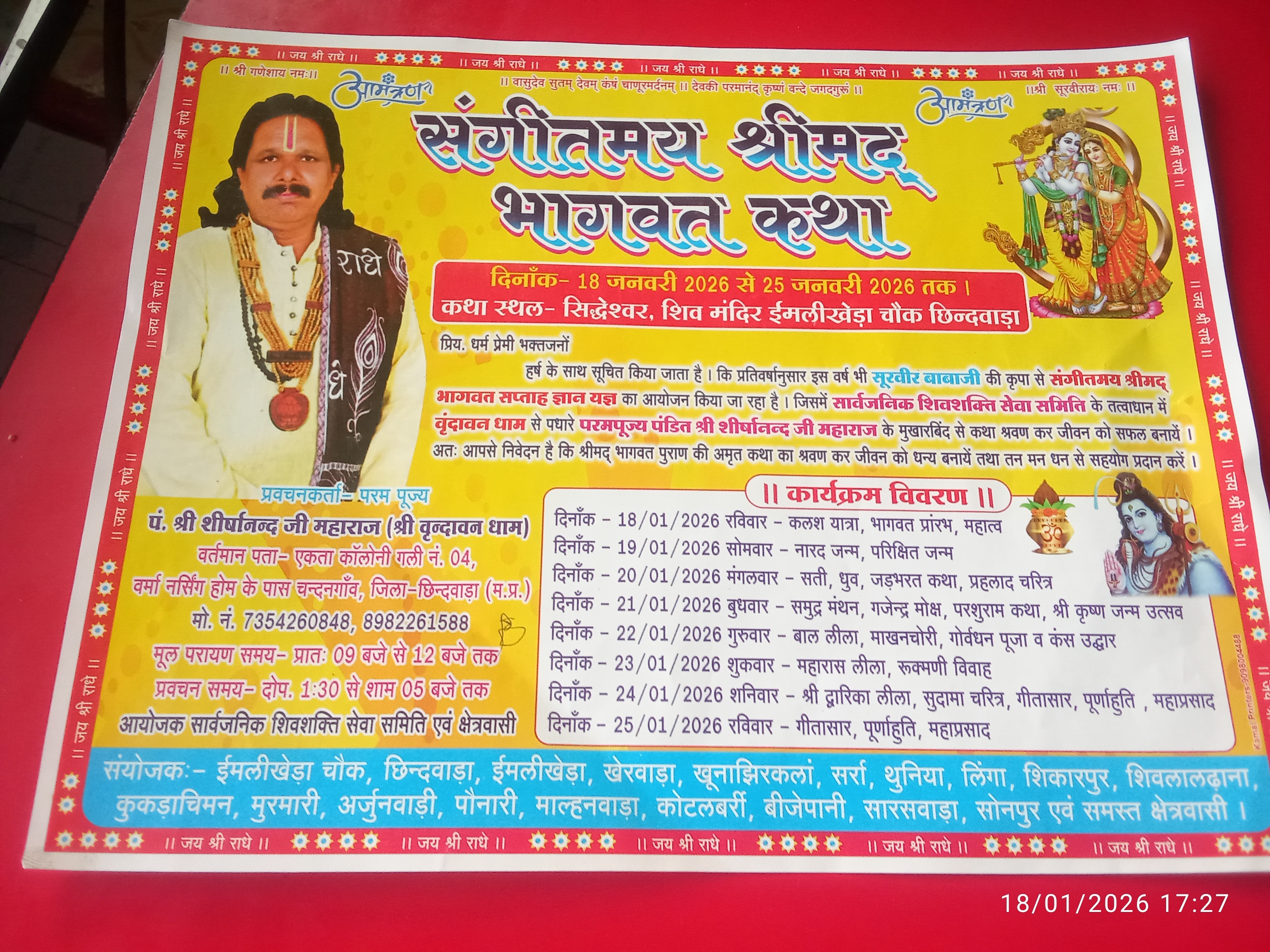 छिंदवाड़ा के इमलीखेड़ा चौक में संगीतमय भागवत का आयोजन २५जनवरी 26 तक आयोजन होगा ।
