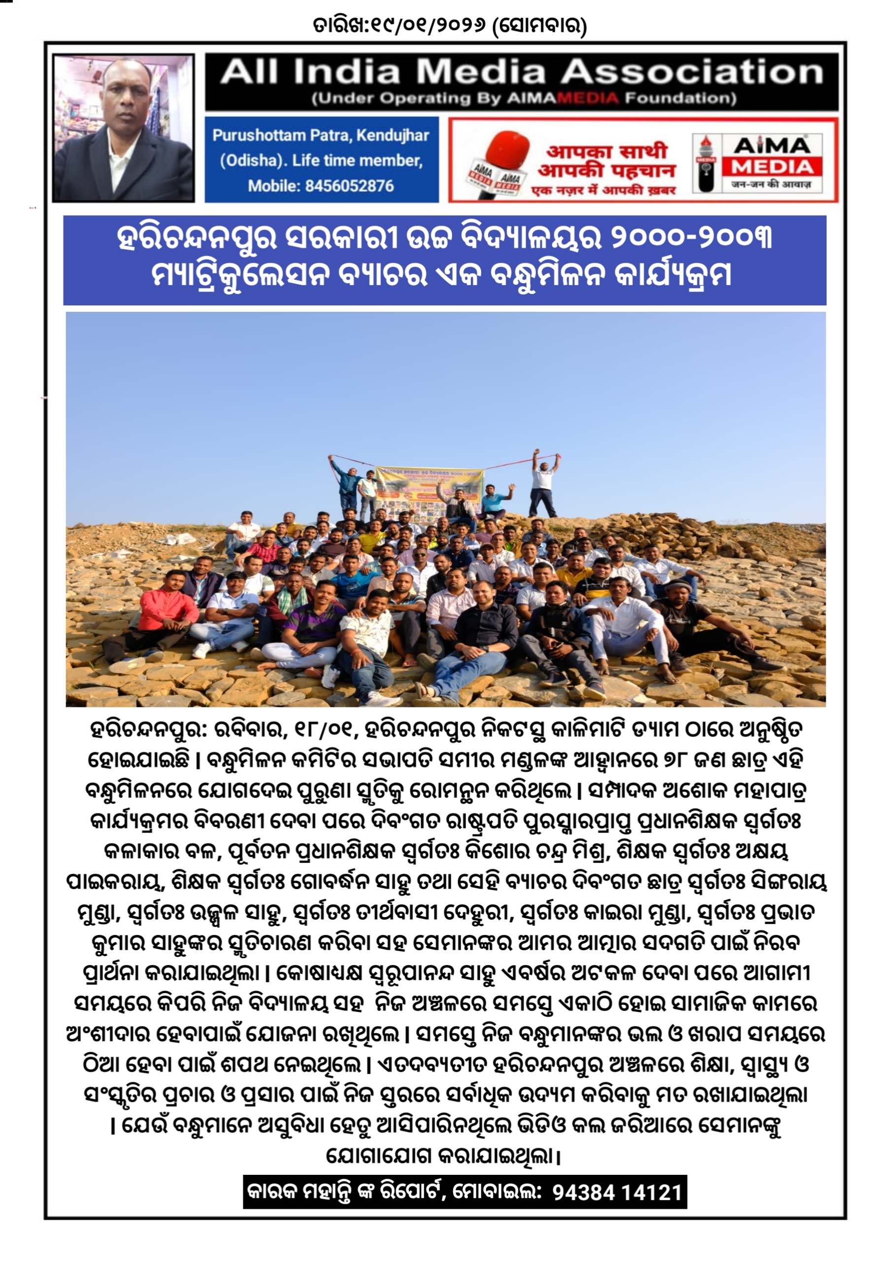 ହରିଚନ୍ଦନପୁର: ରବିବାର, ୧୮ ଜାନୁଆରୀ ୨୦୨୬ ଦିନ ହରିଚନ୍ଦନପୁର ନିକଟସ୍ଥ କାଳିମାଟି ଡ୍ୟାମ ଠାରେ ଅନୁଷ୍ଠିତ ହୋଇଯାଇଛି l ବନ୍ଧୁମିଳନ କମିଟିର ସଭାପତି ସମୀର ମଣ୍ଡଳଙ୍କ ଆହ୍ୱାନରେ ୭୮ ଜଣ ଛାତ୍ର ଏହି ବନ୍ଧୁମିଳନରେ ଯୋଗଦେଇ ପୁରୁଣା ସ୍ମୃତିକୁ ରୋମନ୍ଥନ କରିଥିଲେ l ସମ୍ପାଦକ ଅଶୋକ ମହାପାତ୍ର କାର୍ଯ୍ୟକ୍ରମର ବିବରଣୀ ଦେବା ପରେ ଦିବଂଗତ ରାଷ୍ଟ୍ରପତି ପୁରସ୍କାରପ୍ରାପ୍ତ ପ୍ରଧାନଶିକ୍ଷକ ସ୍ବର୍ଗତଃ କଳାକାର ବଳ, ପୂର୍ବତନ ପ୍ରଧାନଶିକ୍ଷକ ସ୍ବର୍ଗତଃ କିଶୋର ଚନ୍ଦ୍ର ମିଶ୍ର, ଶିକ୍ଷକ ସ୍ବର୍ଗତଃ ଅକ୍ଷୟ ପାଇକରାୟ, ଶିକ୍ଷକ ସ୍ବର୍ଗତଃ ଗୋବର୍ଦ୍ଧନ ସାହୁ ତଥା ସେହି ବ୍ୟାଚର ଦିବଂଗତ ଛାତ୍ର ସ୍ବର୍ଗତଃ ସିଙ୍ଗରାୟ ମୁଣ୍ଡା, ସ୍ବର୍ଗତଃ ଉଜ୍ଜ୍ୱଳ ସାହୁ, ସ୍ବର୍ଗତଃ ତୀର୍ଥବାସୀ ଦେହୁରୀ, ସ୍ବର୍ଗତଃ କାଇରା ମୁଣ୍ଡା, ସ୍ବର୍ଗତଃ ପ୍ରଭାତ କୁମାର ସାହୁଙ୍କର ସ୍ମୃତିଚାରଣ କରିବା ସହ ସେମାନଙ୍କର ଆମର ଆତ୍ମାର ସଦଗତି ପାଇଁ ନିରବ ପ୍ରାର୍ଥନା କରାଯାଇଥିଲା l କୋଷାଧ୍ୟକ୍ଷ ସ୍ୱରୂପାନନ୍ଦ ସାହୁ ଏବର୍ଷର ଅଟକଳ ଦେବା ପରେ ଆଗାମୀ ସମୟରେ କିପରି ନିଜ ବିଦ୍ୟାଳୟ ସହ ନିଜ ଅଞ୍ଚଳରେ ସମସ୍ତେ ଏକାଠି ହୋଇ ସାମାଜିକ କାମରେ ଅଂଶୀଦାର ହେବାପାଇଁ ଯୋଜନା ରଖିଥିଲେ l ସମସ୍ତେ ନିଜ ବନ୍ଧୁମାନଙ୍କର ଭଲ ଓ ଖରାପ ସମୟରେ ଠିଆ ହେବା ପାଇଁ ଶପଥ ନେଇଥିଲେ l ଏତଦବ୍ୟତୀତ ହରିଚନ୍ଦନପୁର ଅଞ୍ଚଳରେ ଶିକ୍ଷା, ସ୍ୱାସ୍ଥ୍ୟ ଓ ସଂସ୍କୃତିର ପ୍ରଚାର ଓ ପ୍ରସାର ପାଇଁ ନିଜ ସ୍ତରରେ ସର୍ବାଧିକ ଉଦ୍ୟମ କରିବାକୁ ମତ ରଖାଯାଇଥିଲା l ଯେଉଁ ବନ୍ଧୁମାନେ ଅସୁବିଧା ହେତୁ ଆସିପାରିନଥିଲେ ଭିଡିଓ କଲ ଜରିଆରେ ସେମାନଙ୍କୁ ଯୋଗାଯୋଗ କରାଯାଇଥିଲା l