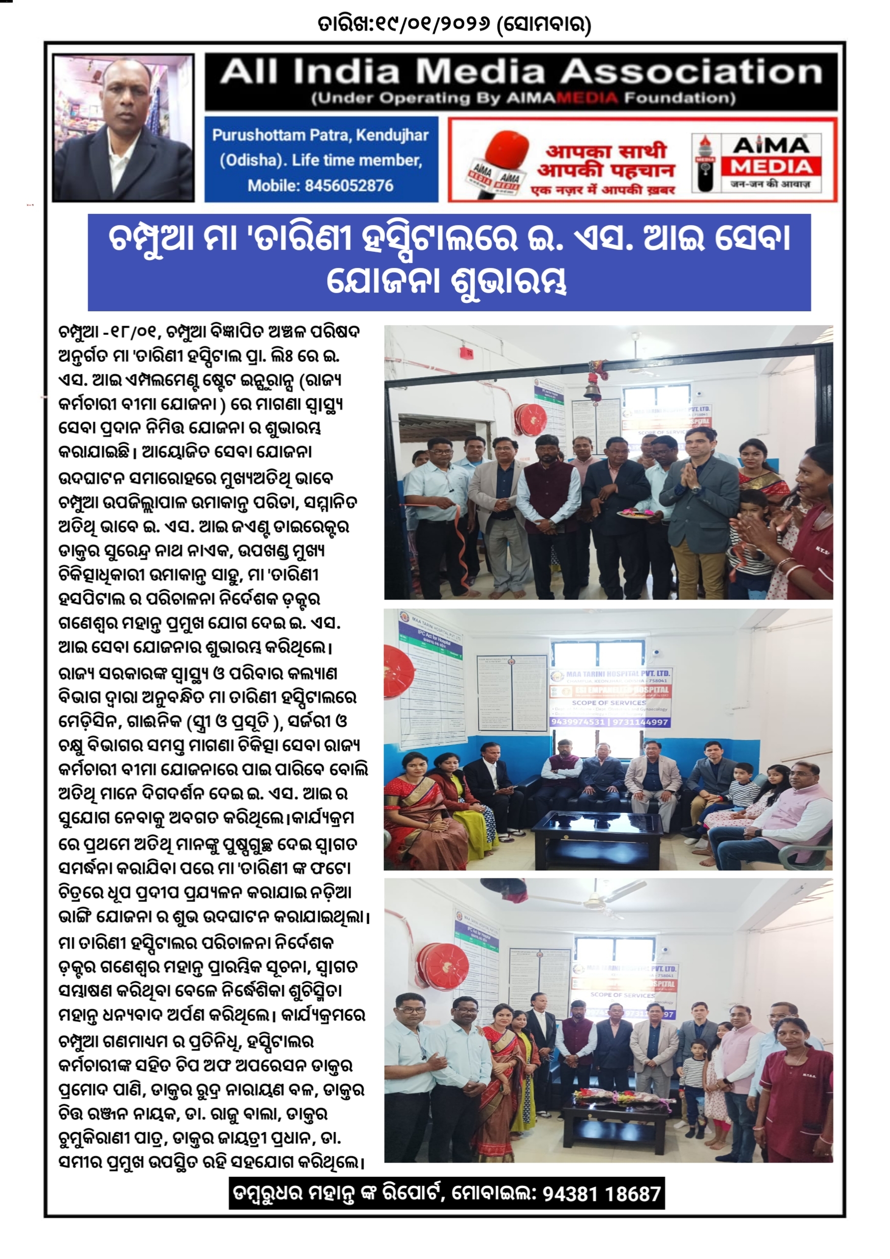 ଚମ୍ପୁଆ -୧୮/୦୧, ଚମ୍ପୁଆ ବିଜ୍ଞାପିତ ଅଞ୍ଚଳ ପରିଷଦ ଅନ୍ତର୍ଗତ ମା 'ତାରିଣୀ ହସ୍ପିଟାଲ ପ୍ରା. ଲିଃ ରେ ଇ. ଏସ. ଆଇ ଏମ୍ପଲମେଣ୍ଟ ଷ୍ଟେଟ ଇନ୍ସୁରାନ୍ସ (ରାଜ୍ୟ କର୍ମଚାରୀ ବୀମା ଯୋଜନା ) ରେ ମାଗଣା ସ୍ଵlସ୍ଥ୍ୟ ସେବା ପ୍ରଦାନ ନିମିତ୍ତ ଯୋଜନା ର ଶୁଭାରମ୍ଭ କରାଯାଇଛି l ଆୟୋଜିତ ସେବା ଯୋଜନା ଉଦଘାଟନ ସମାରୋହରେ ମୁଖ୍ୟଅତିଥି ଭାବେ ଚମ୍ପୁଆ ଉପଜିଲ୍ଲାପାଳ ଉମାକାନ୍ତ ପରିଡା, ସମ୍ମାନିତ ଅତିଥି ଭାବେ ଇ. ଏସ. ଆଇ ଜଏଣ୍ଟ ଡାଇରେକ୍ଟର ଡାକ୍ତର ସୁରେନ୍ଦ୍ର ନାଥ ନାଏକ, ଉପଖଣ୍ଡ ମୁଖ୍ୟ ଚିକିତ୍ସାଧିକାରୀ ଉମାକାନ୍ତ ସାହୁ, ମା 'ତାରିଣୀ ହସପିଟାଲ ର ପରିଚାଳନା ନିର୍ଦେଶକ ଡ଼କ୍ଟର ଗଣେଶ୍ୱର ମହାନ୍ତ ପ୍ରମୁଖ ଯୋଗ ଦେଇ ଇ. ଏସ. ଆଇ ସେବା ଯୋଜନାର ଶୁଭାରମ୍ଭ କରିଥିଲେ l ରାଜ୍ୟ ସରକାରଙ୍କ ସ୍ଵlସ୍ଥ୍ୟ ଓ ପରିବାର କଲ୍ୟାଣ ବିଭାଗ ଦ୍ଵାରା ଅନୁବନ୍ଧିତ ମା ତାରିଣୀ ହସ୍ପିଟାଲରେ ମେଡ଼ିସିନ, ଗାଈନିକ (ସ୍ତ୍ରୀ ଓ ପ୍ରସୂତି ), ସର୍ଜରୀ ଓ ଚକ୍ଷୁ ବିଭାଗର ସମସ୍ତ ମାଗଣା ଚିକିତ୍ସା ସେବା ରାଜ୍ୟ କର୍ମଚାରୀ ବୀମା ଯୋଜନାରେ ପାଇ ପାରିବେ ବୋଲି ଅତିଥି ମାନେ ଦିଗଦର୍ଶନ ଦେଇ ଇ. ଏସ. ଆଇ ର ସୁଯୋଗ ନେବାକୁ ଅବଗତ କରିଥିଲେ l କାର୍ଯ୍ୟକ୍ରମ ରେ ପ୍ରଥମେ ଅତିଥି ମାନଙ୍କୁ ପୁଷ୍ପଗୁଚ୍ଛ ଦେଇ ସ୍ଵlଗତ ସମର୍ଦ୍ଧନା କରାଯିବା ପରେ ମା 'ତାରିଣୀ ଙ୍କ ଫଟୋ ଚିତ୍ରରେ ଧୂପ ପ୍ରଦୀପ ପ୍ରଯ୍ୟଳନ କରାଯାଇ ନଡ଼ିଆ ଭାଙ୍ଗି ଯୋଜନା ର ଶୁଭ ଉଦଘାଟନ କରାଯାଇଥିଲା l ମା ତାରିଣୀ ହସ୍ପିଟାଲର ପରିଚାଳନା ନିର୍ଦେଶକ ଡ଼କ୍ଟର ଗଣେଶ୍ୱର ମହାନ୍ତ ପ୍ରାରମ୍ଭିକ ସୂଚନା, ସ୍ଵlଗତ ସମ୍ଭାଷଣ କରିଥିବା ବେଳେ ନିର୍ଦ୍ଧେଶିକା ଶୁଚିସ୍ମିତା ମହାନ୍ତ ଧନ୍ୟବାଦ ଅର୍ପଣ କରିଥିଲେ l କାର୍ଯ୍ୟକ୍ରମରେ ଚମ୍ପୁଆ ଗଣମାଧ୍ୟମ ର ପ୍ରତିନିଧି, ହସ୍ପିଟାଲର କର୍ମଚାରୀଙ୍କ ସହିତ ଚିପ ଅଫ ଅପରେସନ ଡାକ୍ତର ପ୍ରମୋଦ ପାଣି, ଡାକ୍ତର ରୁଦ୍ର ନାରାୟଣ ବଳ, ଡାକ୍ତର ଚିତ୍ତ ରଞ୍ଜନ ନାୟକ, ଡା. ରାଜୁ ଵାଲା, ଡାକ୍ତର ଚୁମୁକିରାଣୀ ପାତ୍ର, ଡାକ୍ତର ଜାୟତ୍ରୀ ପ୍ରଧାନ, ଡା. ସମୀର ପ୍ରମୁଖ ଉପସ୍ଥିତ ରହି ସହଯୋଗ କରିଥିଲେ l