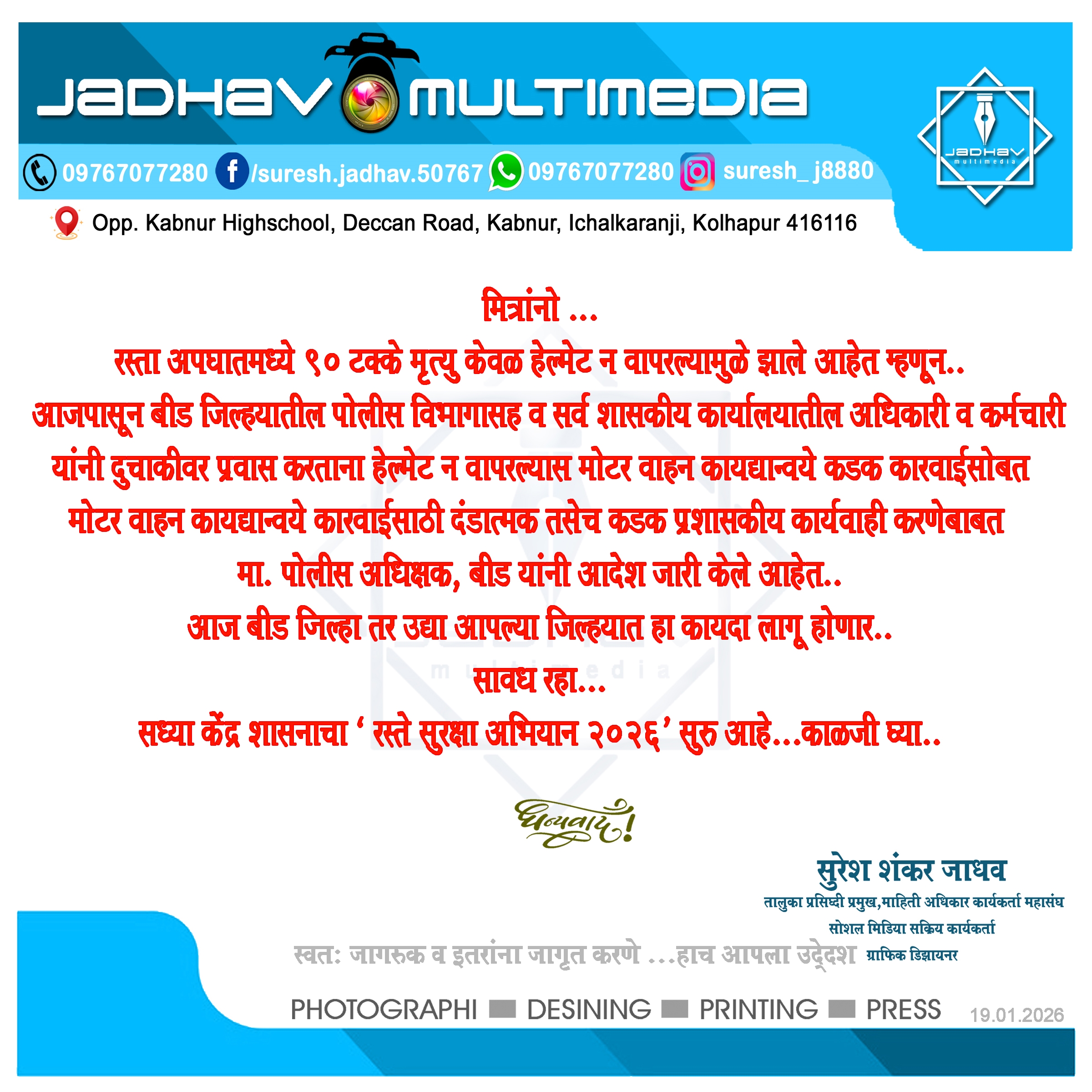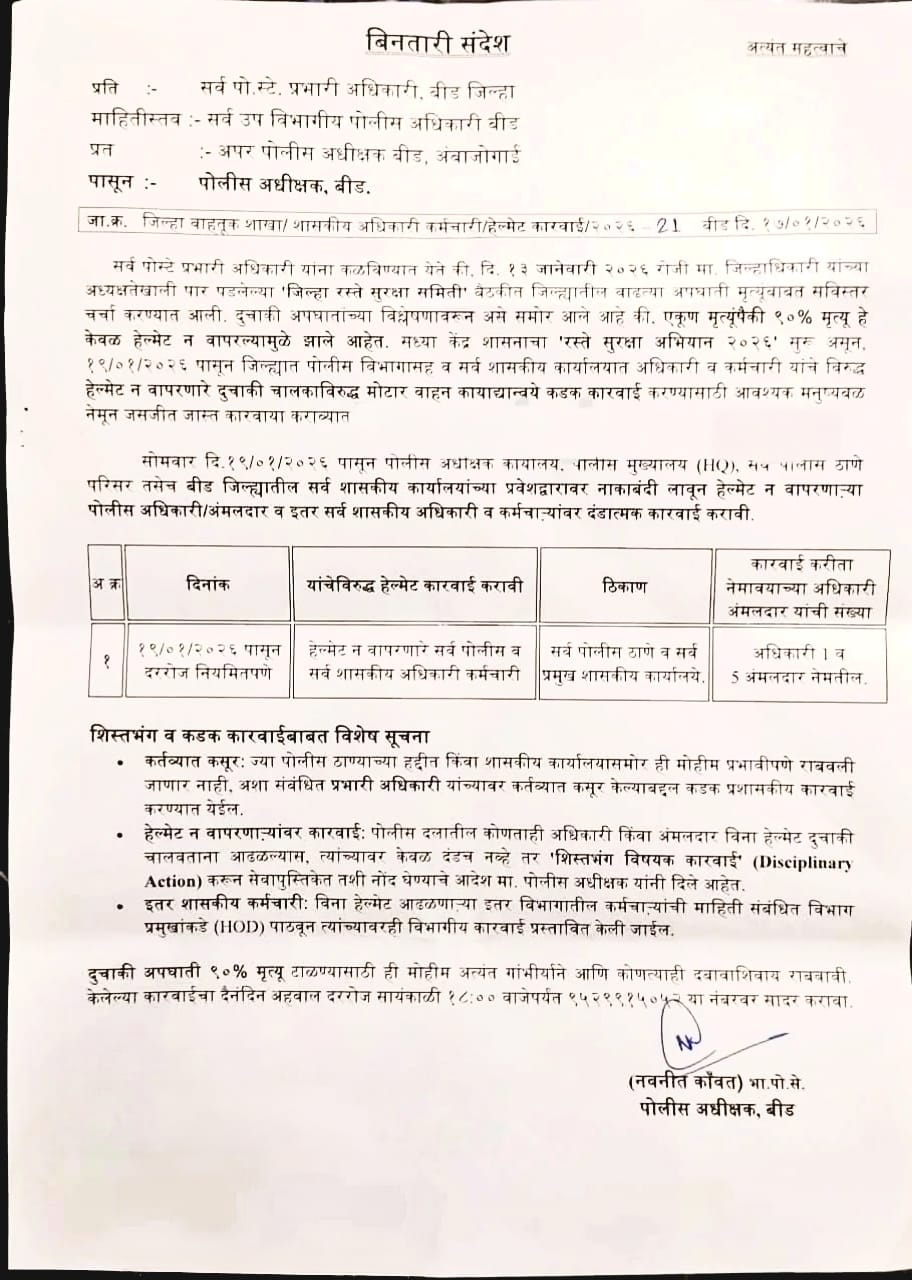 आज पासून बीड जिल्ह्यात हेल्मेट सक्ती ... पोलीस अधीक्षक मा. नवनीत कौवत(भा.पो.से.) दि . 19/01/2026
